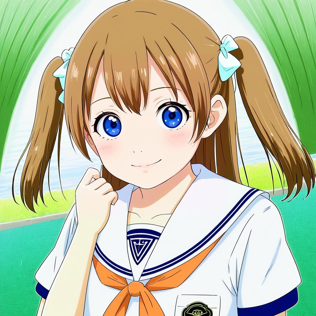 Illustration of an anime girl with long brown hair styled into twin ponytails with light blue bows. She has large, expressive blue eyes and wears a white and navy blue sailor-style school uniform with an orange neckerchief, representing the Nami Junior High School uniform. The background features a green and blue abstract design.