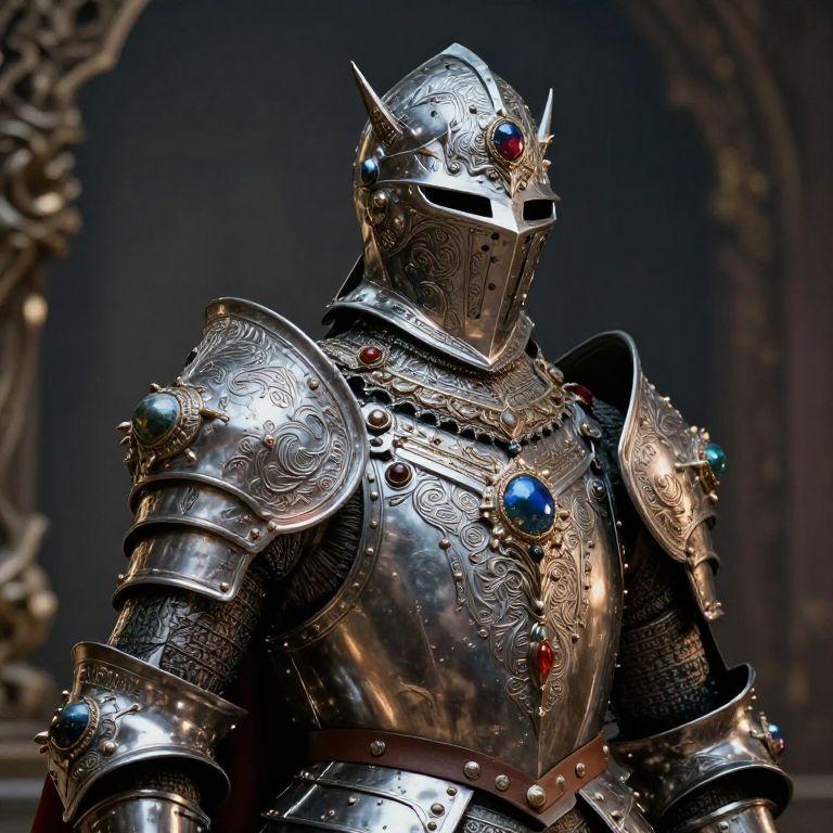 Ornate plate armor with a majestic helmet, covered in elaborate engravings and ornamental spikes, richly decorated with jewels and intricate metalwork, surreal fantasy setting with dramatic shadows and epic scale, hyper-detailed armor textures