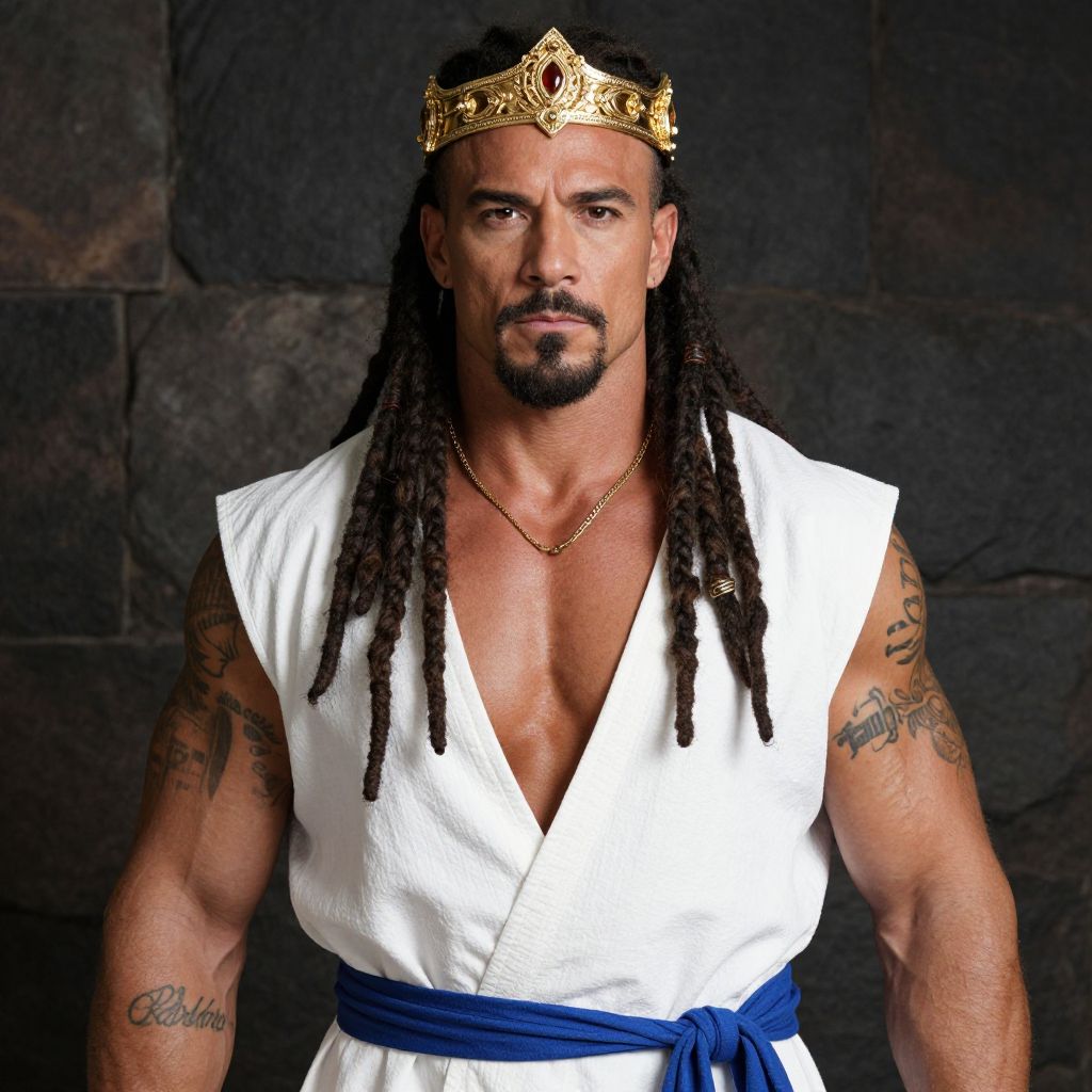 Photograph of a muscular, tan-skinned man with long black dreadlocks wearing a gold crown and a white sleeveless tunic with a deep V-neck. He has several tattoos on his arms and chest, a gold necklace, and a blue sash around his waist. He has a serious expression and a goatee. The background is a dark, stone wall.