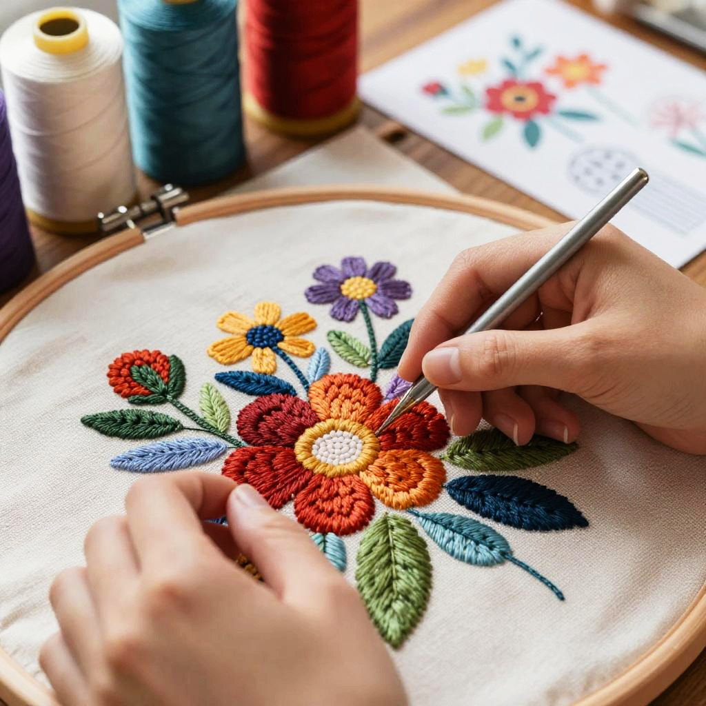 Close-up of an embroidery pattern maker's hands carefully stitching vibrant floral motifs on textured fabric, surrounded by spools of multicolored threads and pattern sketches, soft natural light enhancing the fine craftsmanship and creative process.