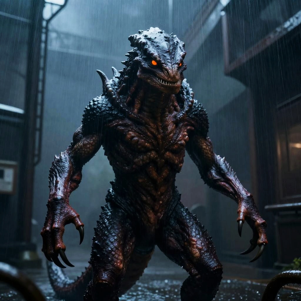 Photograph of a green, reptilian monster with a pointed head, sharp teeth, and scaly skin standing in an urban street. It holds a large wooden staff in its right hand. Background includes buildings, people in vintage clothing, and a car. Textured, menacing posture. Several people in the background, some running. Overhead archway and clock visible. Intense, aggressive facial expression on the monster.