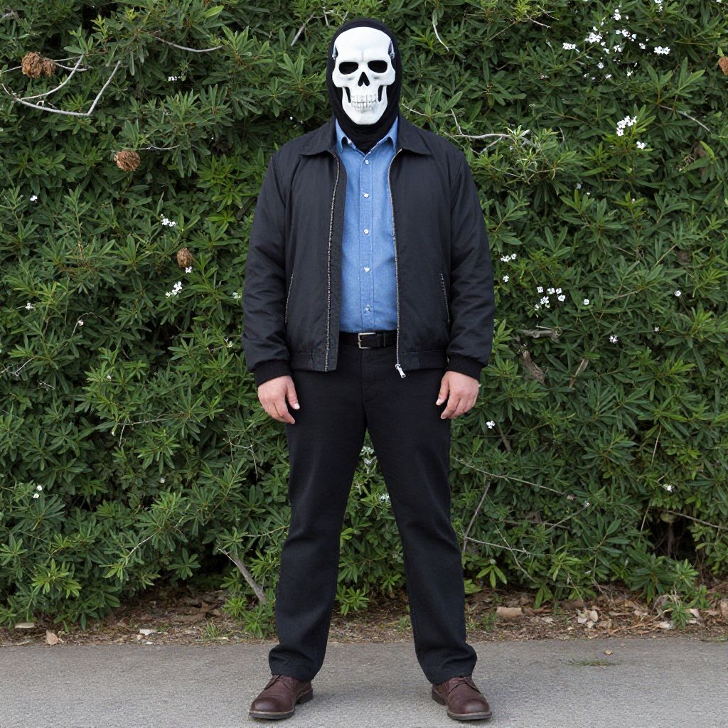 Man with a skeleton mask on his face, wearing a black jacket, blue shirt, black pants, and brown shoes. He is standing in front of a tree with green leaves.