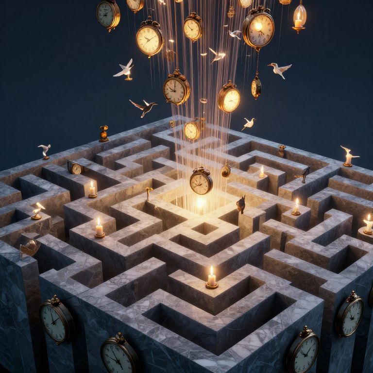 A surreal 3D-rendered labyrinth constructed from interlocking blocks adorned with vintage-style clocks, each encasing glowing candles and delicate birds, evokes a dreamlike atmosphere where time seems to melt and stretch infinitely upward, blending high-definition detail with a hauntingly ethereal aesthetic.