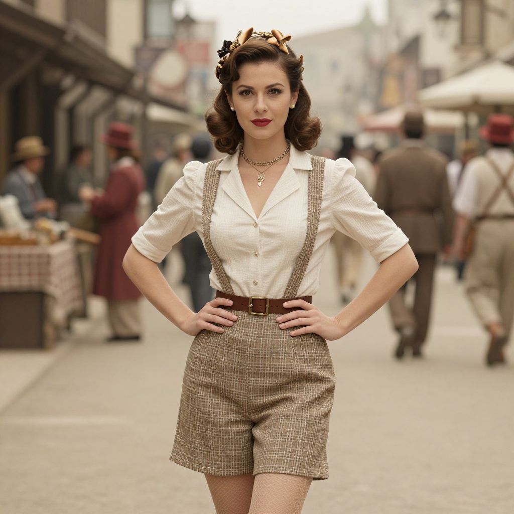 Photograph of a fair-skinned woman with vintage-style, wavy brown hair adorned with a black floral headpiece. She has red lipstick and wears a white, button-up blouse with rolled sleeves, paired with high-waisted, brown checkered shorts secured with brown suspenders. She stands confidently with hands on hips in a bustling, blurred street market, featuring men in brown suits and red hats in the background, and vendors with tables covered in red checkered cloths. The scene has a 1940s retro aesthetic, with soft, natural lighting and muted color tones.
