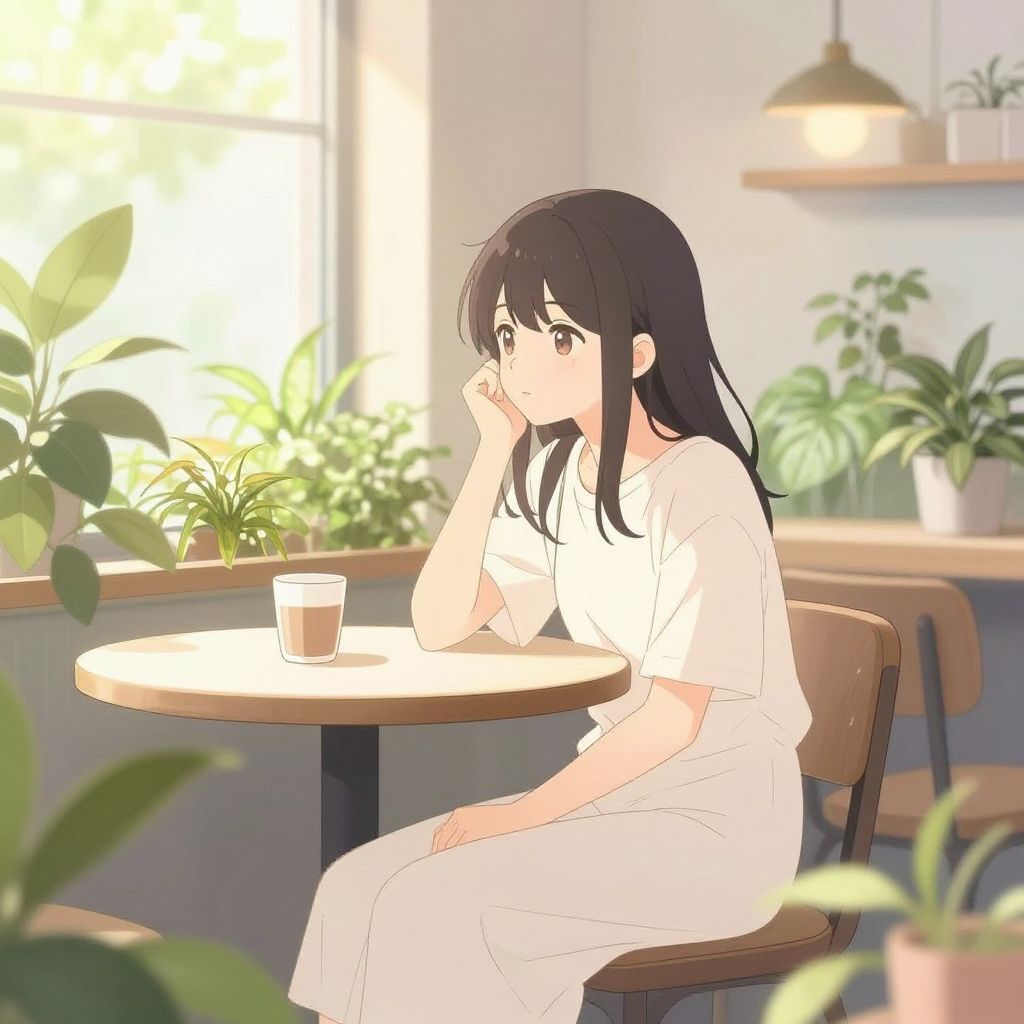 Anime trans girl sitting in a cozy café surrounded by lush plants, soft sunlight filtering through windows, pastel color palette, delicate line art, peaceful and introspective mood