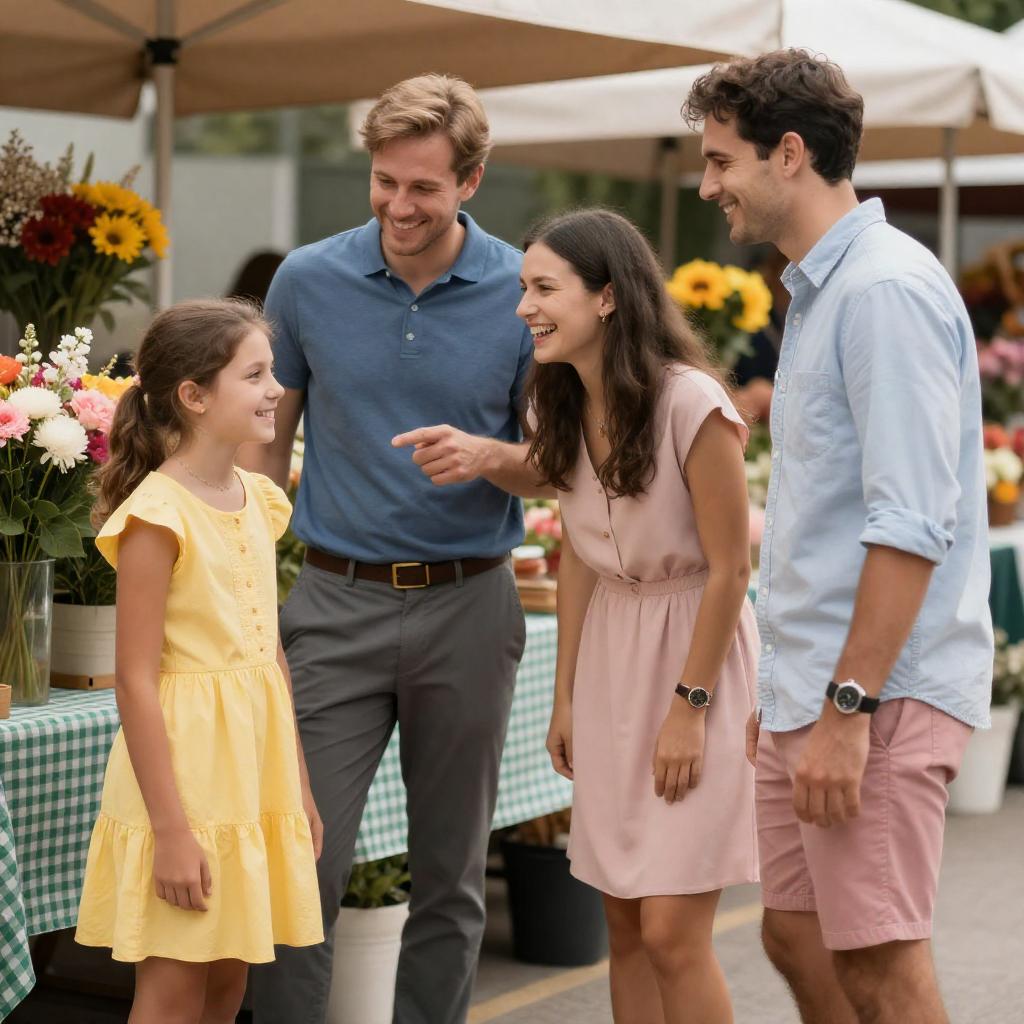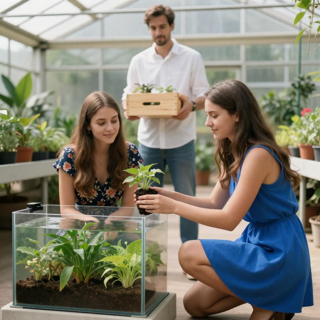 Photograph of three people in a greenhouse. A man in a white shirt stands in the background, holding a wooden box. Two women, one with long brown hair in a floral dress and the other with long brown hair in a blue dress, sit in the foreground. The woman in blue holds a small plant, while the woman in floral kneels beside a clear aquarium filled with greenery. The greenhouse is filled with plants and has a bright, sunny atmosphere.