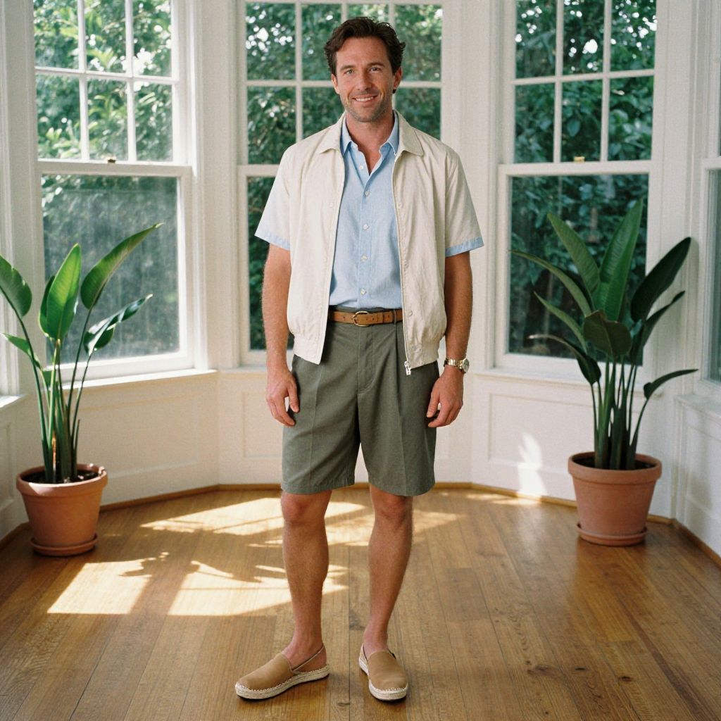 A man, light blue short-sleeve oxford shirt, olive green relaxed-fit shorts, tan espadrilles, cream lightweight bomber jacket, understated leather belt, sunlit wooden floors, large bay windows, potted plants in every corner, oversaturated film, relaxed smile. Man has masculine face and piercing eyes