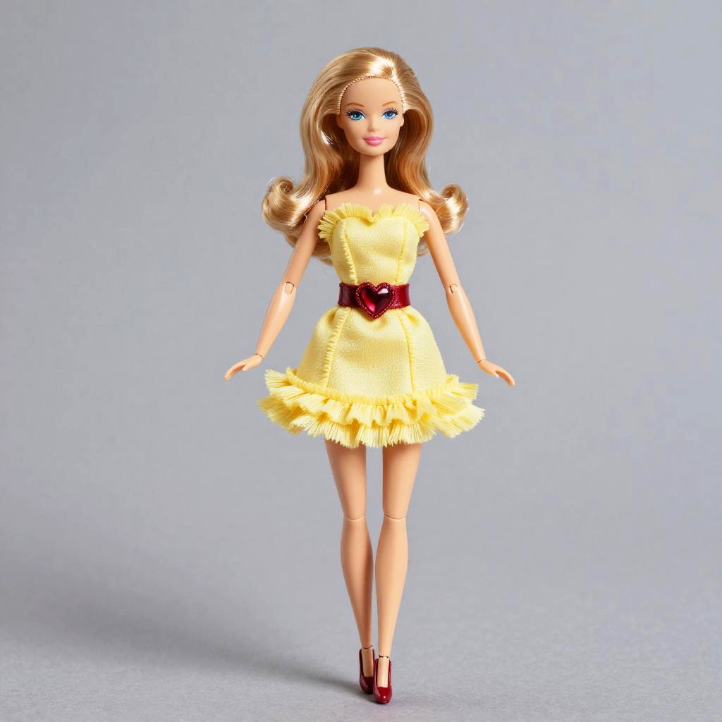 Barbie doll, full-length figure, wearing a pale yellow micro miniskirt with floss ruffles and a wide ruby red belt with ruby heart-shaped buckle