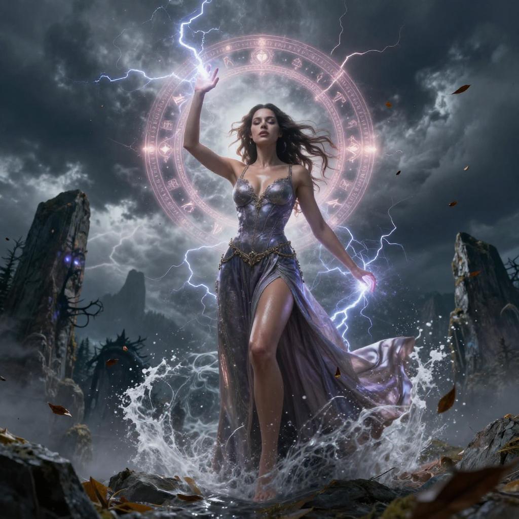 Art by ROBERT MAGUIRE, Masterpiece, best quality, (realistic), beautiful (woman:1.1), in the style of Style-Glorious, shiny skin, soft lighting, (bodycon) wizard robe, windy mountain top, stormy ((backlighting)), ((bloom)), [light sparkles], ((chromatic aberration)), sharp focus, fantasy wizard, (perspective:1.1), (from below:1.1), (erotic wizard robe:1.1), (in the style of Dungeons & Dragons and Lord of the Rings:1.2), (powerful:1.2), casting a spell, swirling water around her, electricity, electricity sparks all around her, pillars of rock coming out of earth, stormy, strong wind, electricity sparks across the ground, leaves fly around her, glowing magical circle, powerful runes, shadow monsters in background, dark forest in background