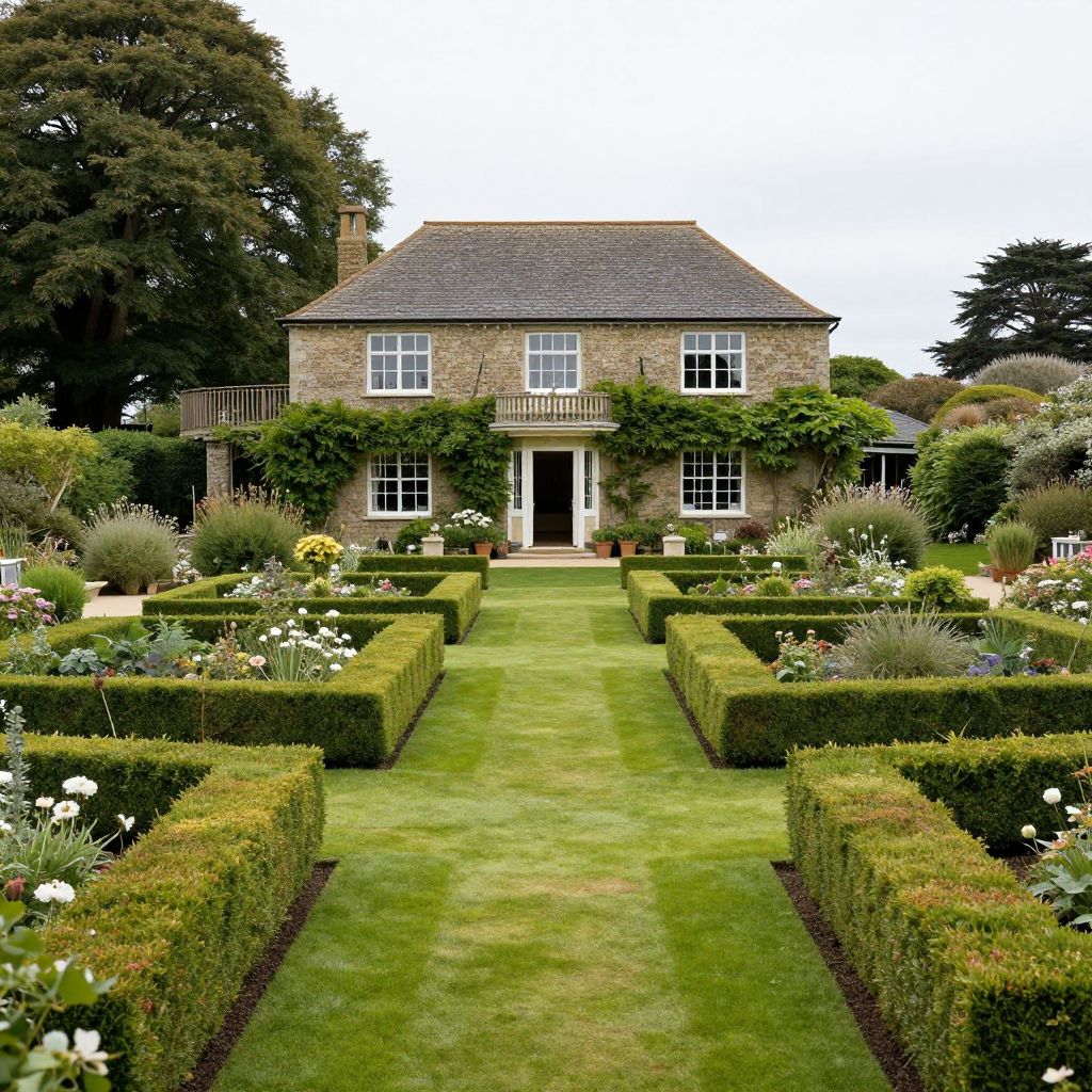 Serenity whispers through the meticulously manicured gardens of Dorset, where the vibrant green of nature harmonizes with the timeless elegance of a coastal home, inviting contemplation and a deep connection to the enduring beauty of life.