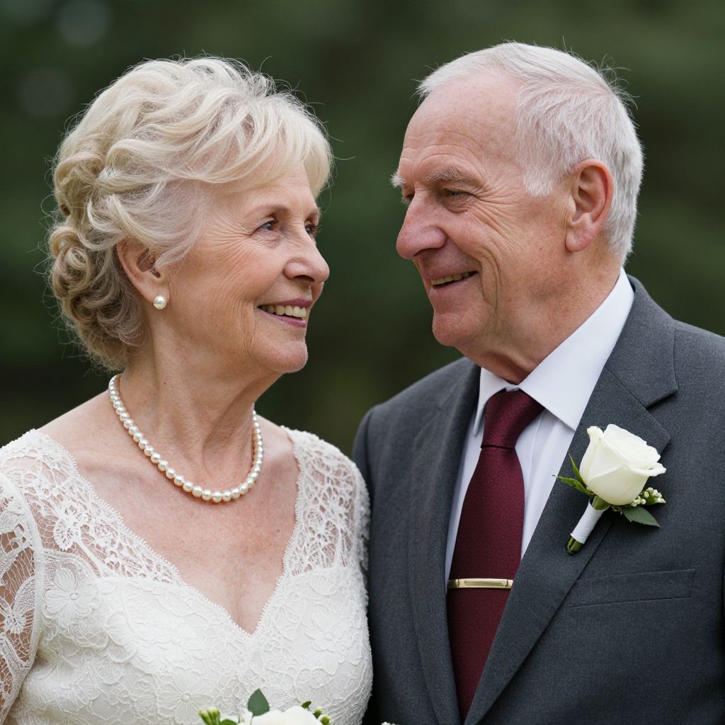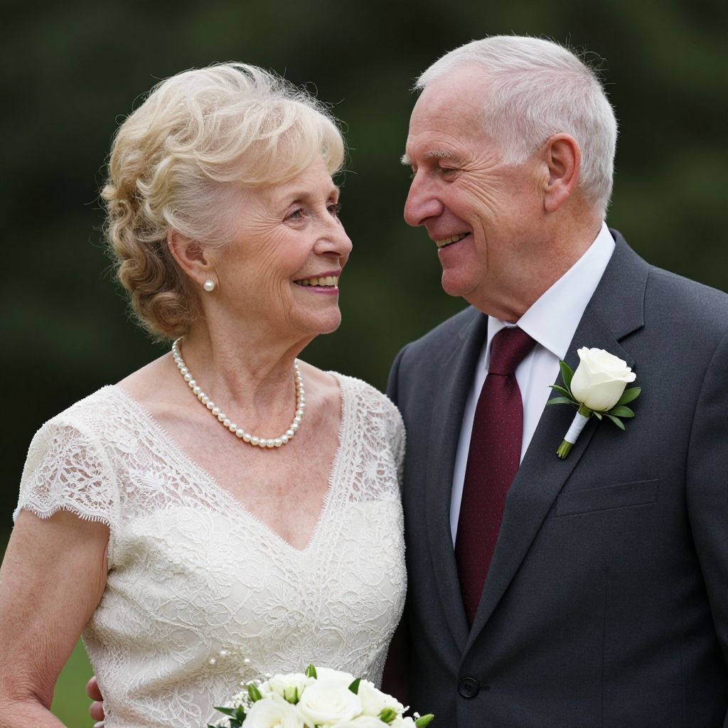 Two elderly individuals share a joyful moment, with the woman wearing a delicate lace wedding dress and pearl jewelry, while the man dons a formal suit with a burgundy tie and a boutonniere featuring a white rose, both smiling warmly as they gaze at each other against a blurred green backdrop.