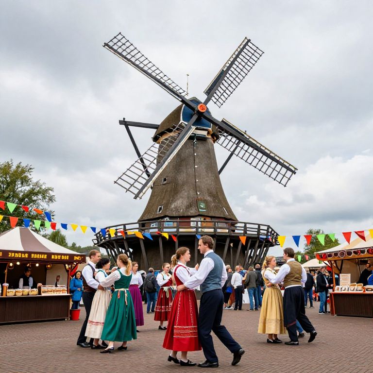 Holand cultural festival scene, people dressed in traditional attire dancing near a wooden windmill, decorated with bright flags and banners, food stalls with local delicacies, lively and colorful atmosphere capturing the spirit of heritage