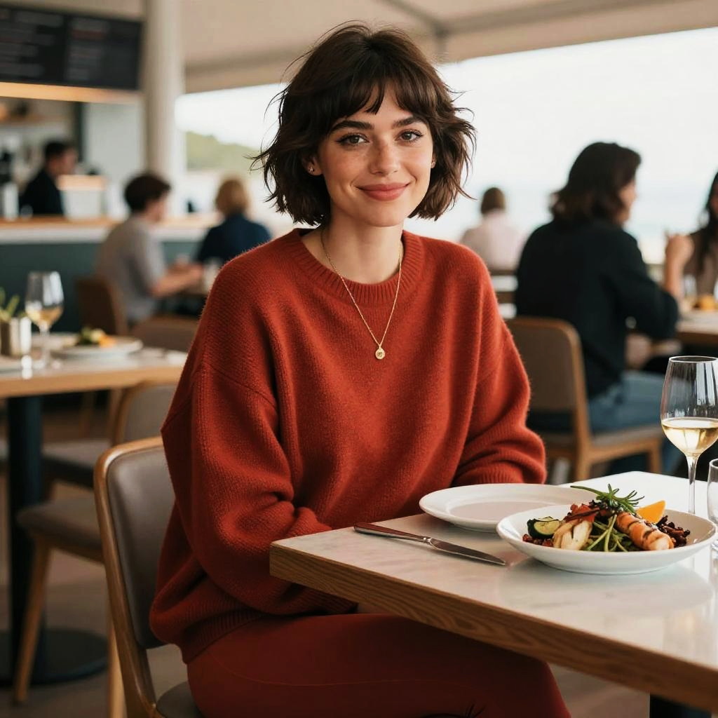 Photograph of a young woman with short, wavy black hair and fair skin, sitting at a modern restaurant table. She wears a loose, rust-colored sweater and a delicate gold necklace with a small pendant. She smiles softly at the camera. On the table in front of her is a white plate with a gourmet dish featuring colorful vegetables and garnishes, and a tall glass of white wine. The background is blurred, showing other diners and a bright, open restaurant space with large windows. The lighting is natural, enhancing the cozy, inviting atmosphere.