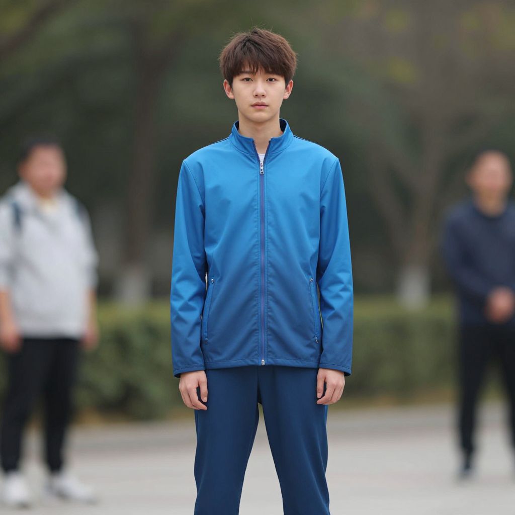 Photograph of a young Asian man with short, dark brown hair, standing in the center of a blurred outdoor setting. He wears a bright blue, zip-up athletic jacket and dark blue pants. His expression is neutral, and he stands with his arms relaxed by his sides. In the background, two blurred figures, one in a white jacket and the other in a dark jacket, stand amidst greenery and trees. The overall color palette includes the man's blue attire, the greenery, and the overcast, muted background. The image has a shallow depth of field, focusing on the man while the background remains out of focus.