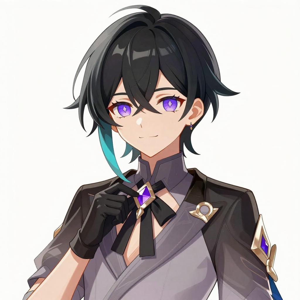 Digital illustration of an anime-style character with short two-tone hair in black and grey with blue-green tips. The character has purple symbol-shaped pupils and is dressed in a collared grey shirt with long sleeves, black gloves, and a black neck ribbon adorned with a purple gemstone. The character has a soft smile and delicate eyelashes, rendered with a polished, illustrious style.