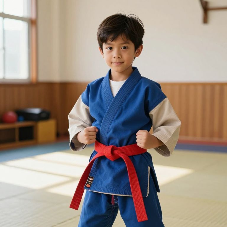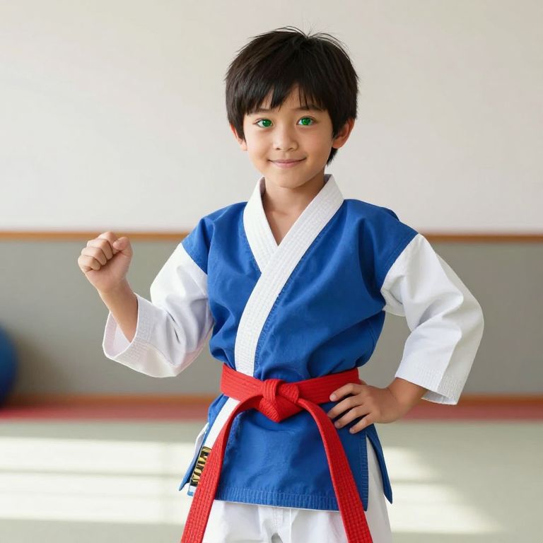 A young boy with short black hair, bright green eyes, and a friendly smile, wearing a traditional karate uniform featuring a clean blue and white shirt with white sleeves, a white obi sash, and a red belt indicating his rank in karate. He stands confidently in a neutral pose, one hand on his hip, the other slightly raised as if preparing a movement, set against a bright, sunny background with a dojo backdrop in the distance, showing a peaceful and disciplined atmosphere.