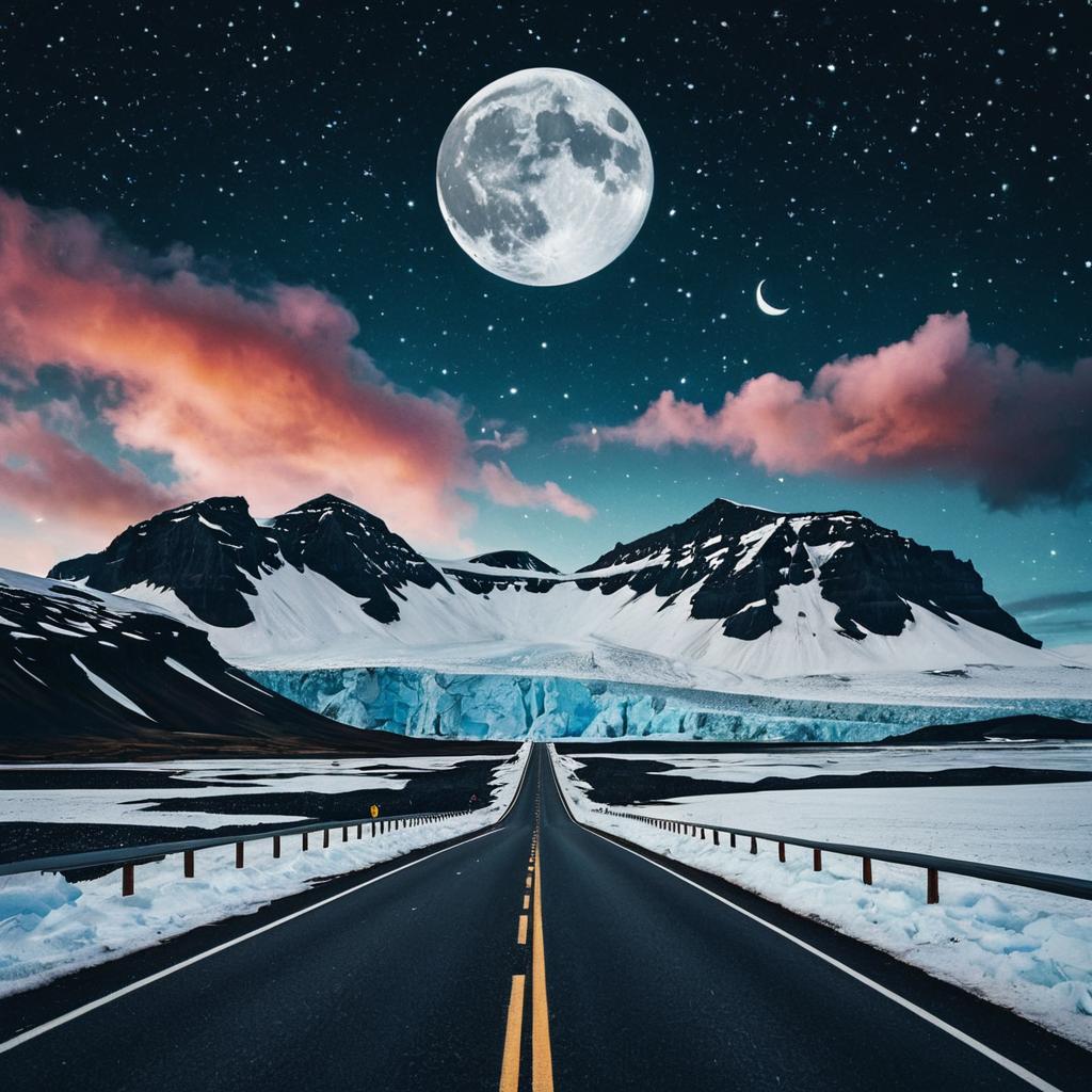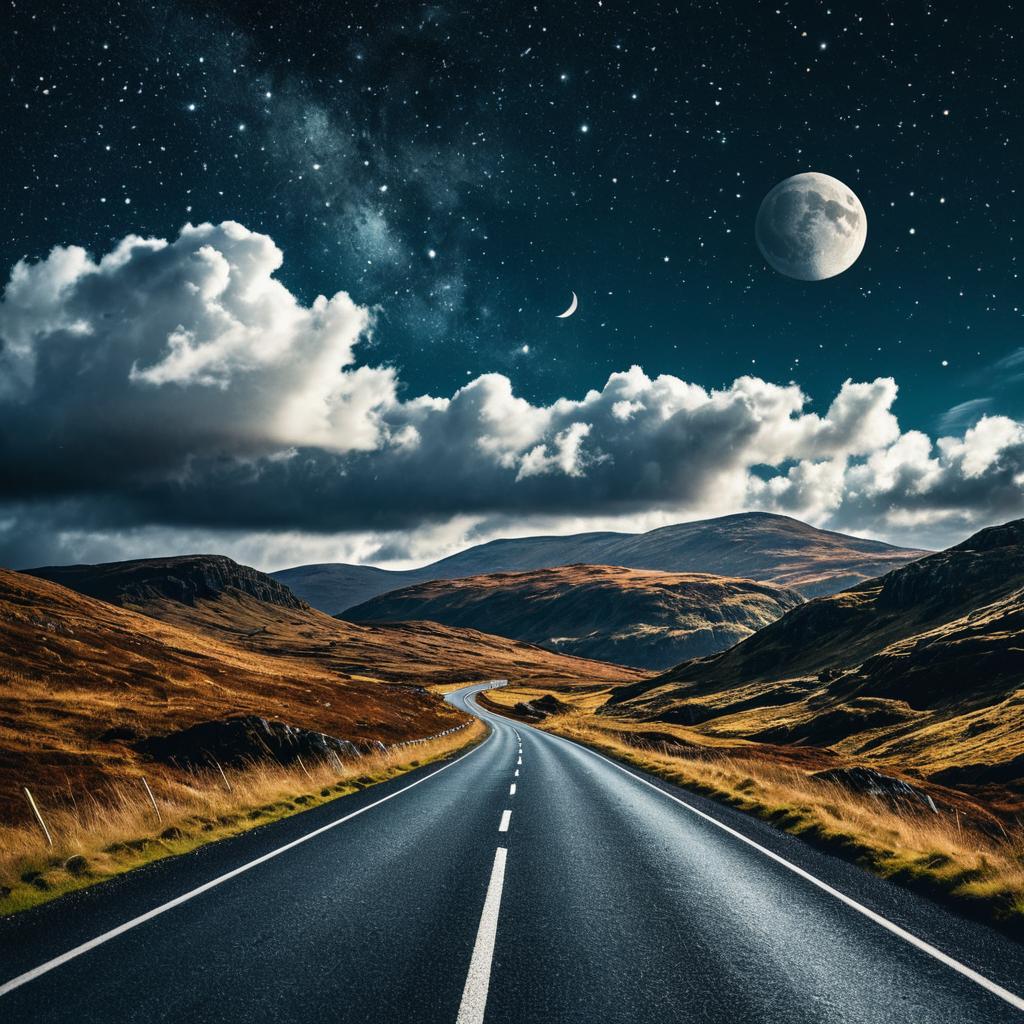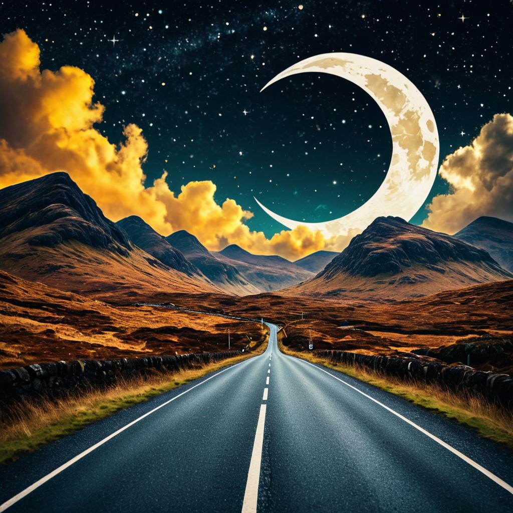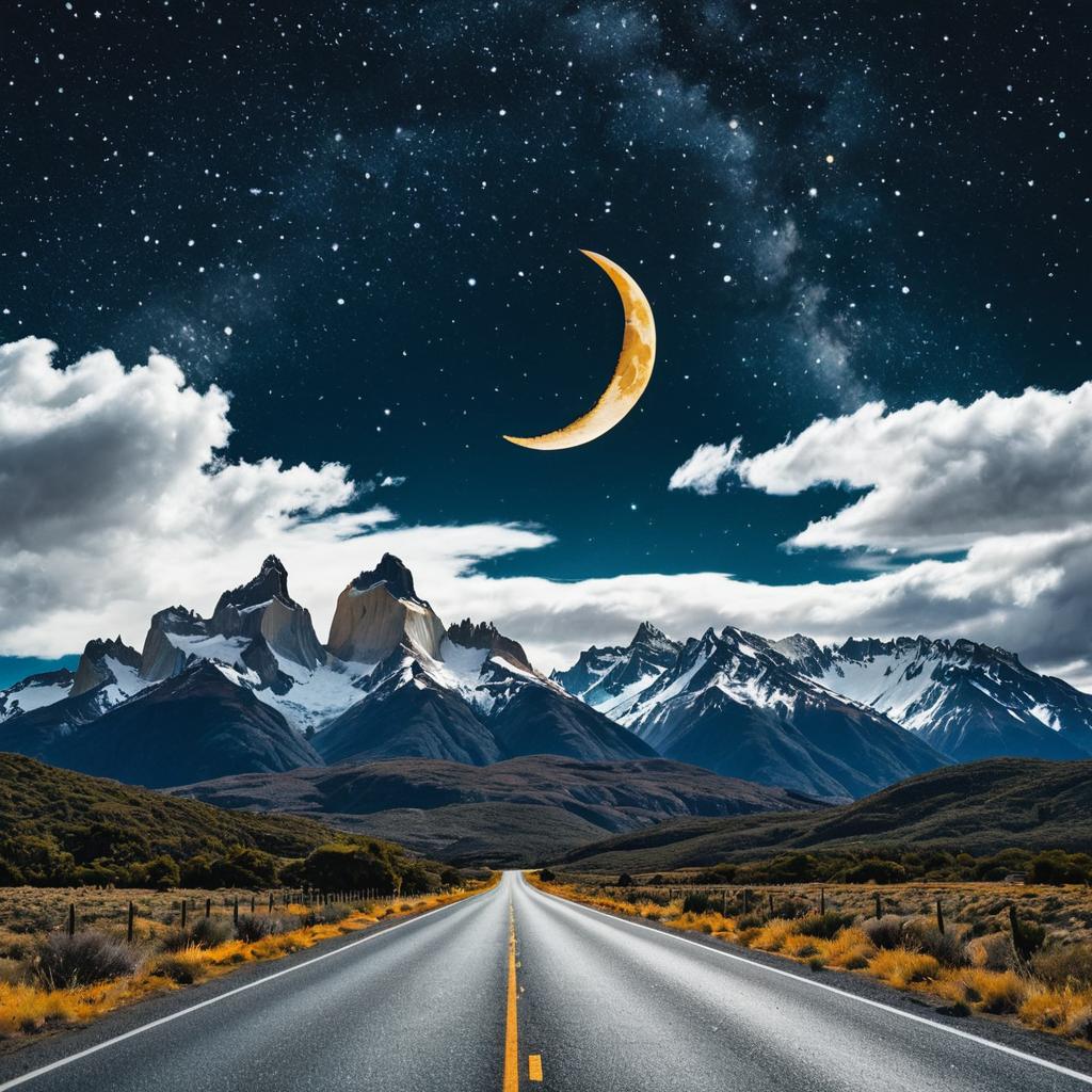 Spinning two-lane road leading toward magical Patagonia, wispy silver clouds peeking from behind mountains, vast shimmering starry sky above, sharp glowing waxing crescent moon hangs high above the clouds. Photoshop mixed media cutout artwork style, bright colors.