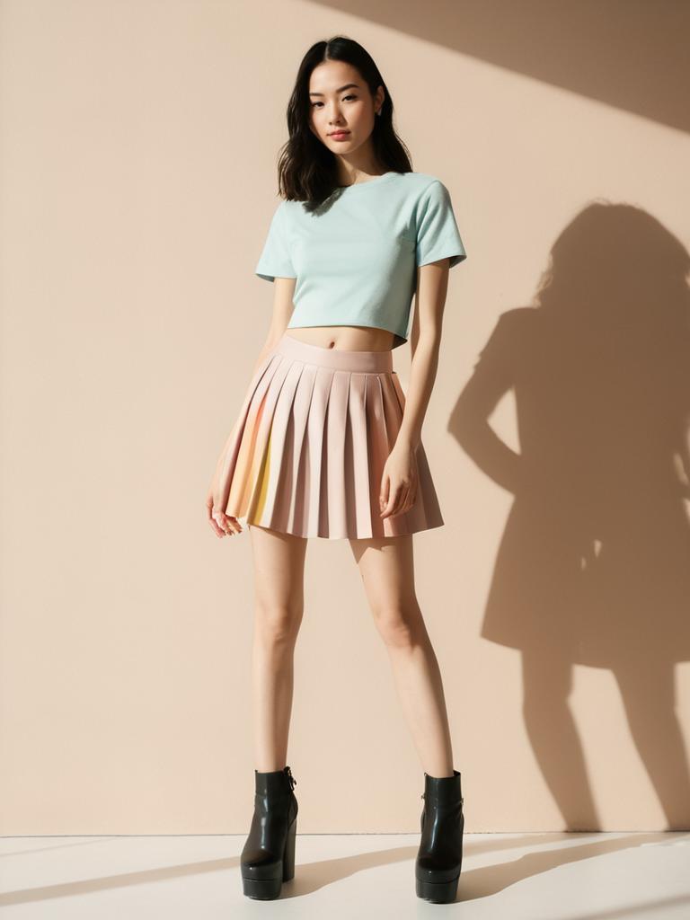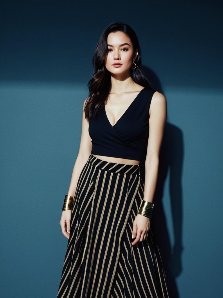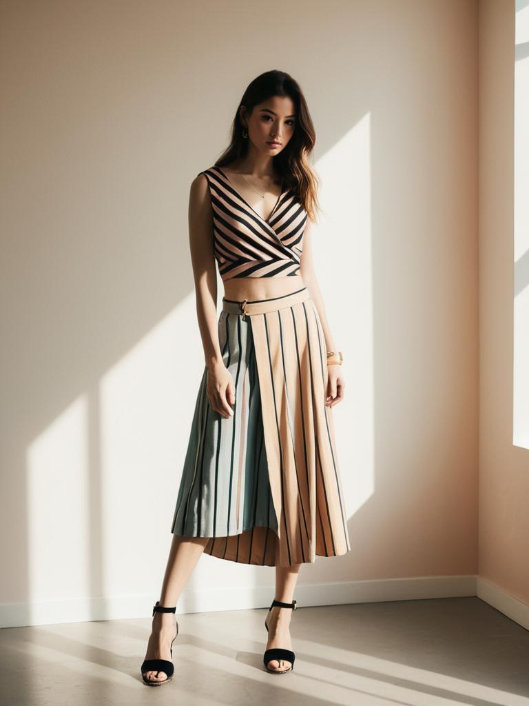 Woman, trendy fashion, black sleeveless crop top with sheer panel, high-waisted pencil skirt with multicolored magazine print, ankle strap high heels. --sref 1399