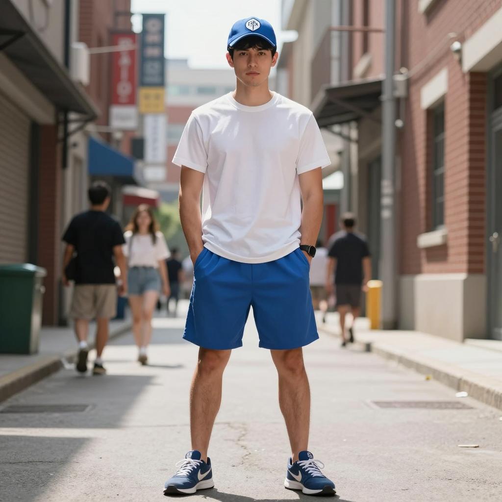 Photorealistic image of a young man standing confidently in an urban alley during daytime. He wears a white t-shirt, blue shorts, blue cap with a white emblem, and blue and white sneakers. His hands are in his pockets, showing muscular legs. The background is slightly blurred with red brick buildings and several pedestrians walking by, emphasizing a modern casual street style.