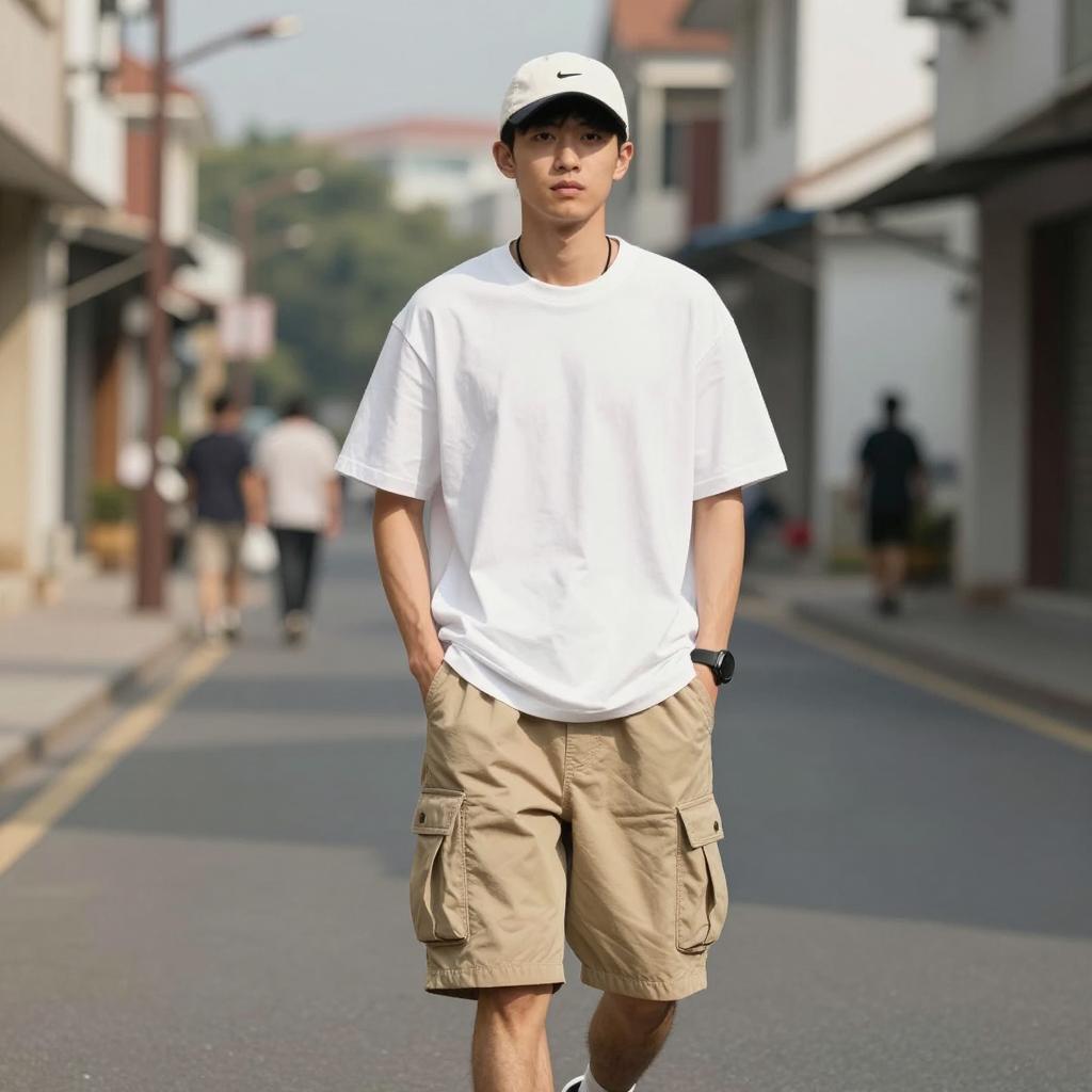 Captain underpants cosplay, photorealistic, young man standing in urban alley, daytime, wearing white t-shirt, blue shorts, blue cap with white emblem, hands in pockets, muscular legs, sneakers, blurred background with red brick buildings and other people, casual outfit, modern street style, sunny light, cool color palette, realistic ures, slight lens flare, confident pose, urban environment, SD/T2I model, realistic lighting, detailed clothing ures