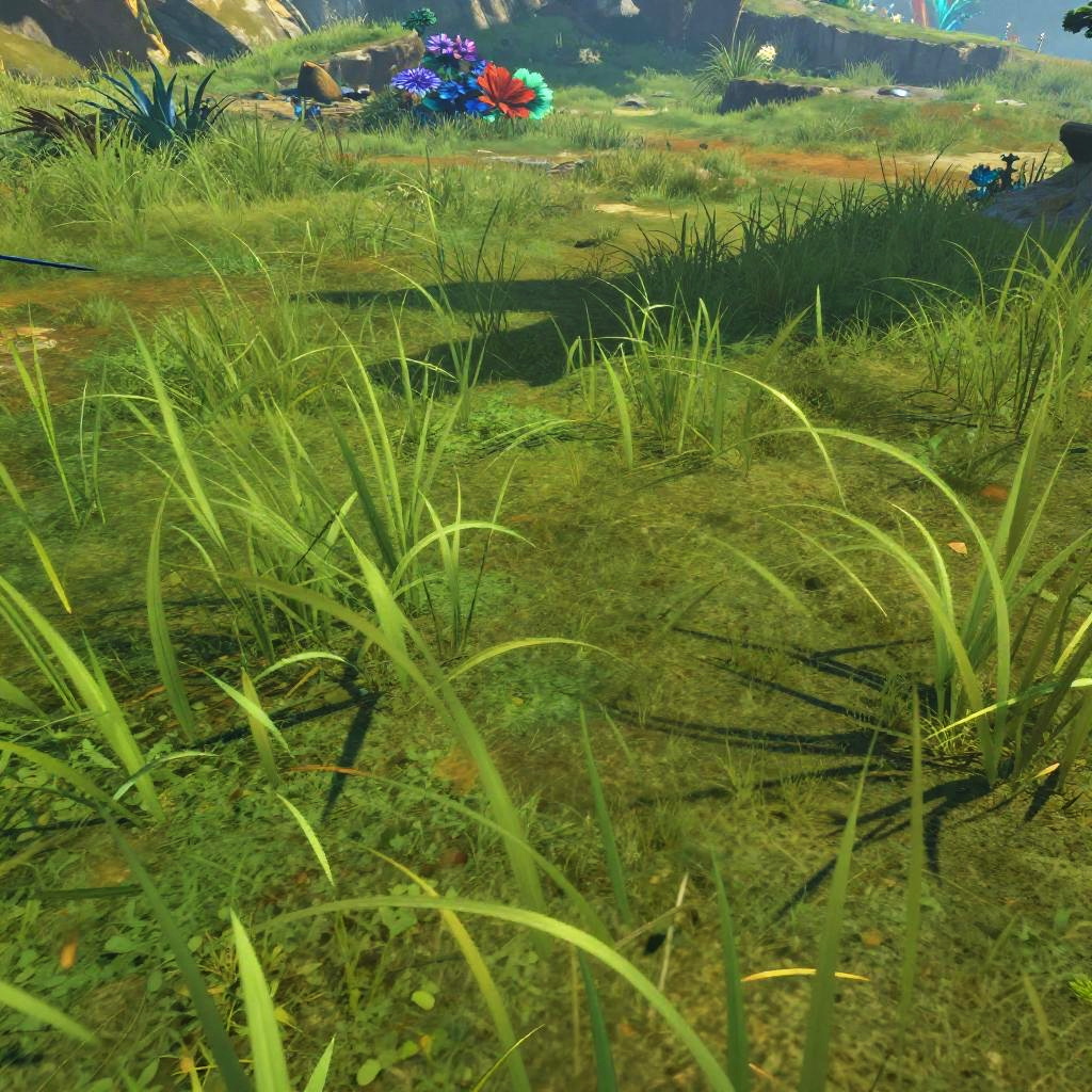 Video game grass in a vibrant open world, lush green blades swaying gently in the breeze, hyper-realistic textures with high detail, bright sunlight casting dynamic shadows, fantasy RPG environment with mystical flora, cinematic lighting