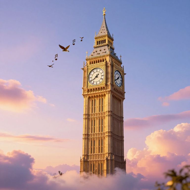 A whimsical 3D-rendered clock tower floats serenely against a vibrant sky, its golden hour glow casting a magical ambiance as it chimes melodies in an ancient, bird-like language, evoking a dreamlike, surreal atmosphere.