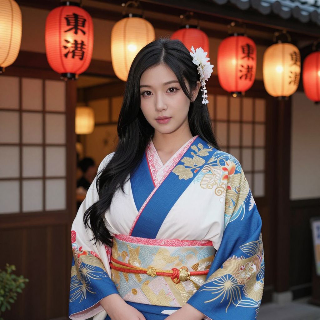 A beautiful Asian woman with long black hair, big tits and a sexy, alluring presence, wearing a beautifully crafted blue and white kimono with intricate gold embroidery and a delicate floral headband. She stands confidently in front of a traditional Japanese-style store, where red lanterns hang gracefully from the ceiling, casting a warm, festive glow. The setting is serene yet vibrant, with soft ambient lighting and a subtle breeze adding movement to the scene. The woman's expression is calm and elegant, exuding charm and sophistication.