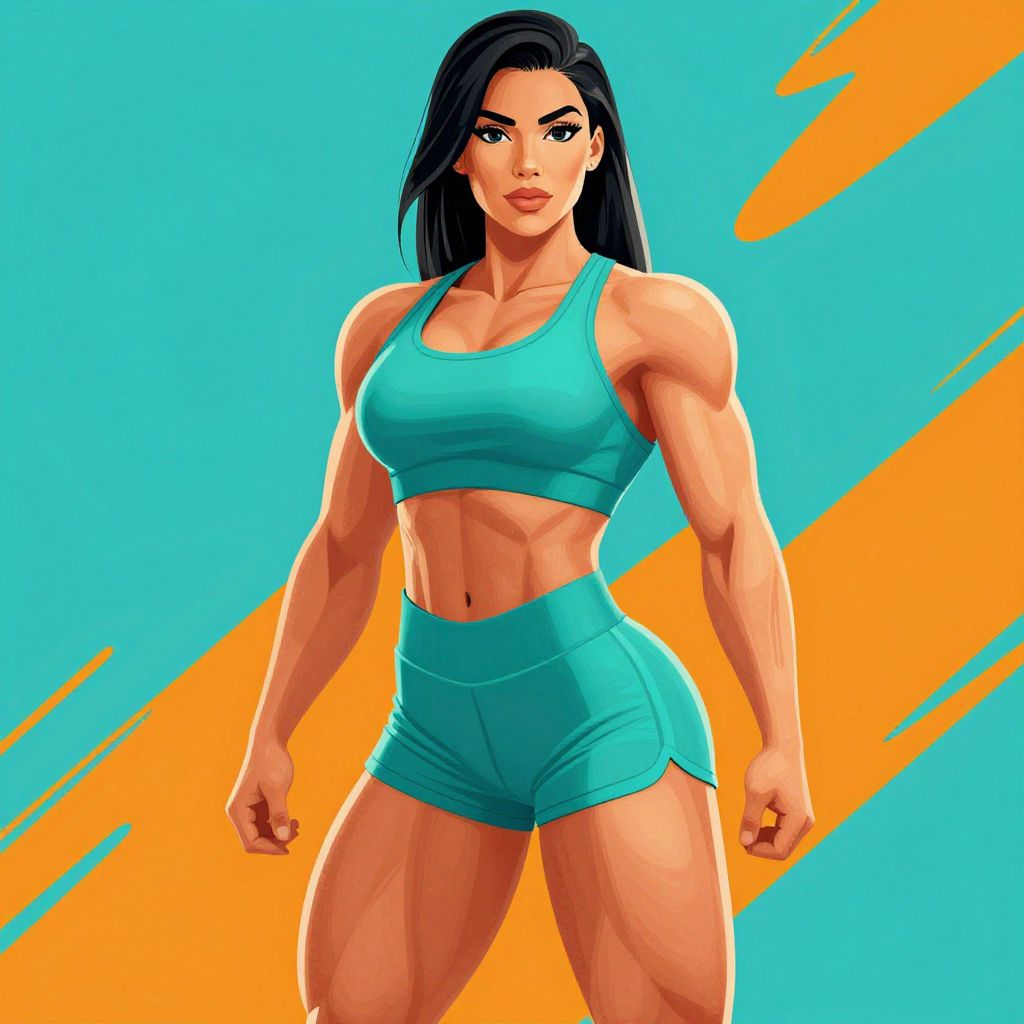 Digital illustration of a muscular, tan-skinned woman with black hair, wearing a teal sports bra and shorts, standing confidently against a bright blue and orange