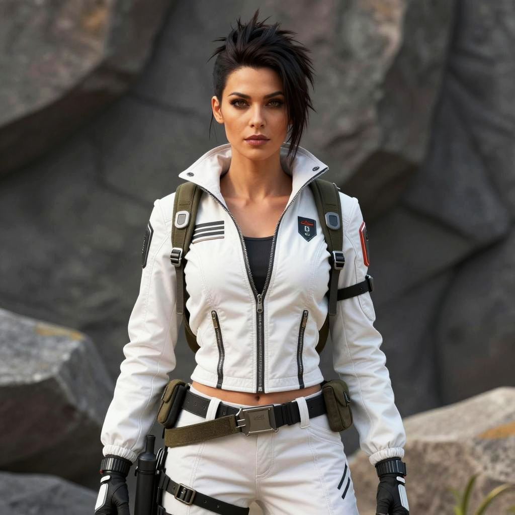 A confident woman dressed in a futuristic white jacket and tactical gear, inspired by the Apex Legends game aesthetic, stands against a natural, rocky background. Her edgy hairstyle and detailed costume emphasize a strong, sci-fi warrior look reminiscent of the game's character design.