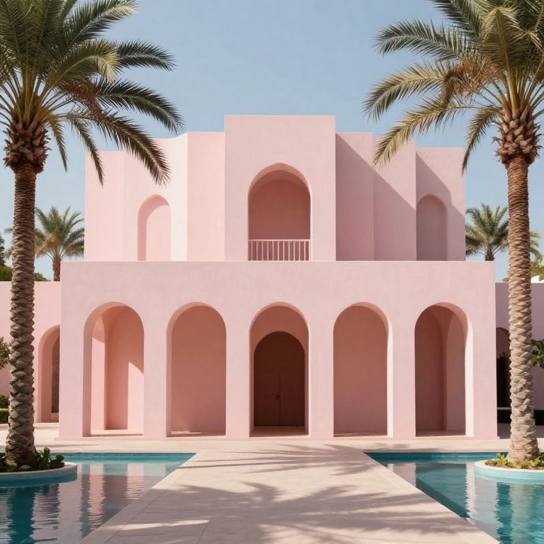 Arquitetonica-inspired architectural design, minimalist structure with repetitive geometric forms, pastel color palette, surrounded by palm trees and water features, sharp shadows, natural lighting enhancing sleek surfaces, cinematic ultra-detailed aesthetic.
