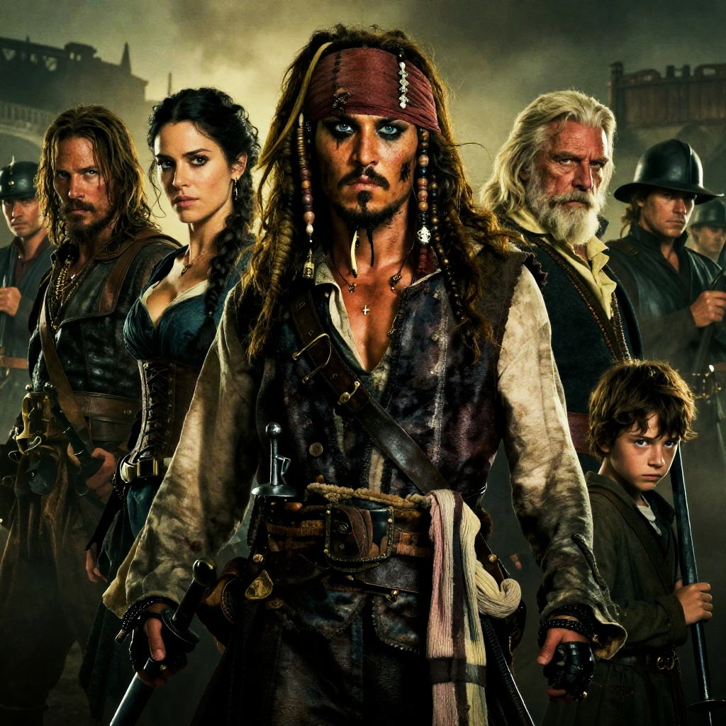 Photograph of "The Lord of the Rings" movie poster. Center: serious-looking man with dark hair. Surrounding: bearded man, woman with serious expression, hooded figure, child pointing, cavalry battle below. Brown, sepia tones. Intense, focused expressions. Total 7 people. Background: stone walls, mist.
