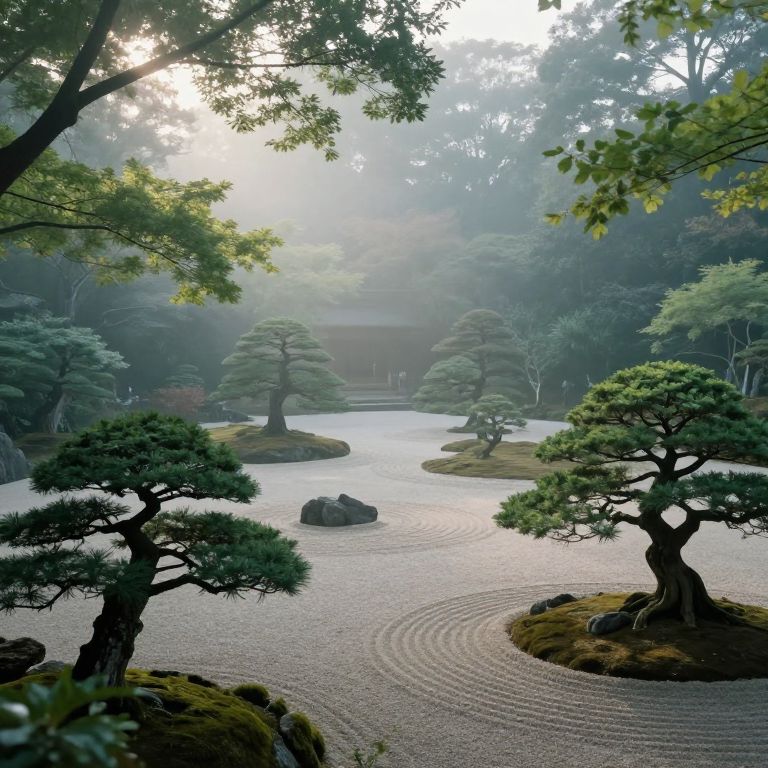 Photograph of a serene Japanese garden with tranquil water ripples, meticulously pruned pine trees, and misty morning light filtering through lush greenery.