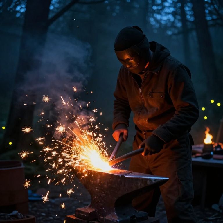 Photograph of a black-clad blacksmith in a forest at dusk, sparking metal on an anvil with bright, fiery sparks.