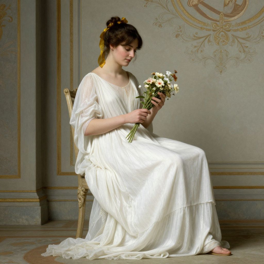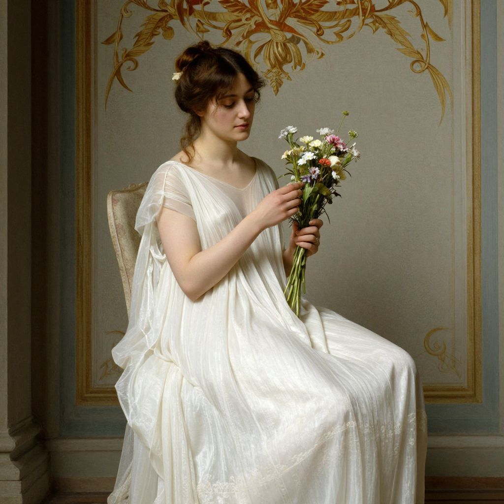 Photograph of a young woman with fair skin and brown hair in an updo, wearing a sheer, white, classical-style gown with draping fabric. She sits on an ornate, beige chair in a room with a light blue, ornately decorated wall featuring gold floral patterns. She holds a small bouquet of white and pink flowers with delicate greenery, gently examining them. The light source is from the front, highlighting her serene expression and the soft texture of her dress. The background is softly lit, emphasizing the elegance and simplicity of the scene.