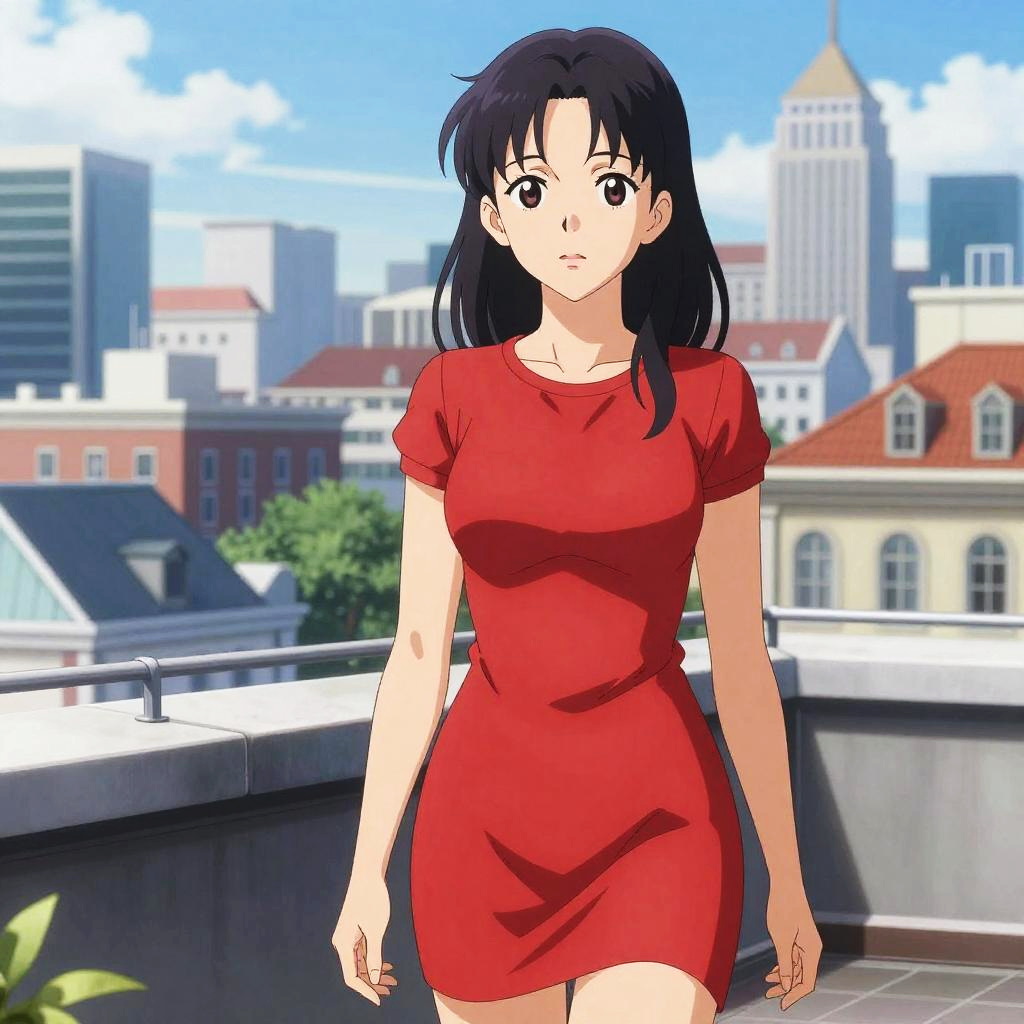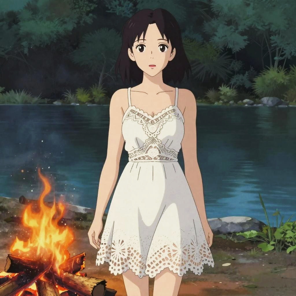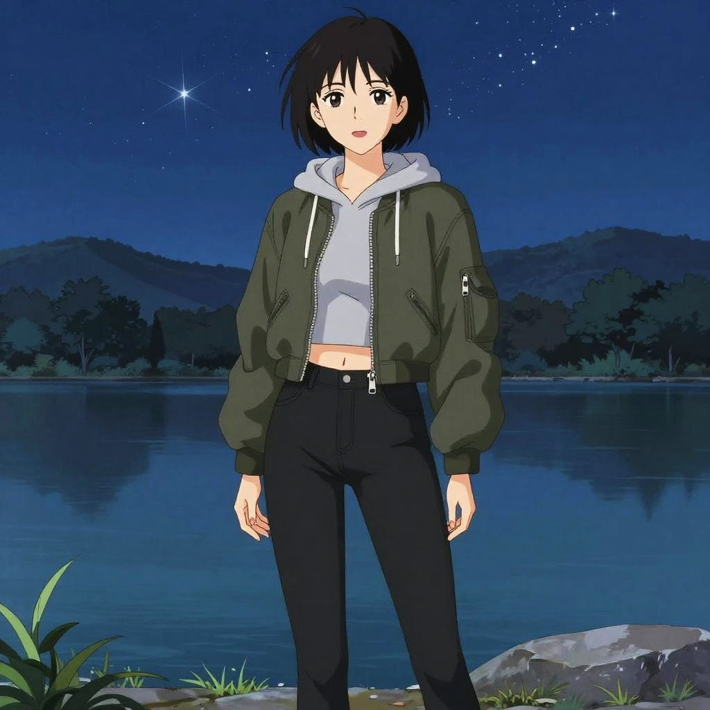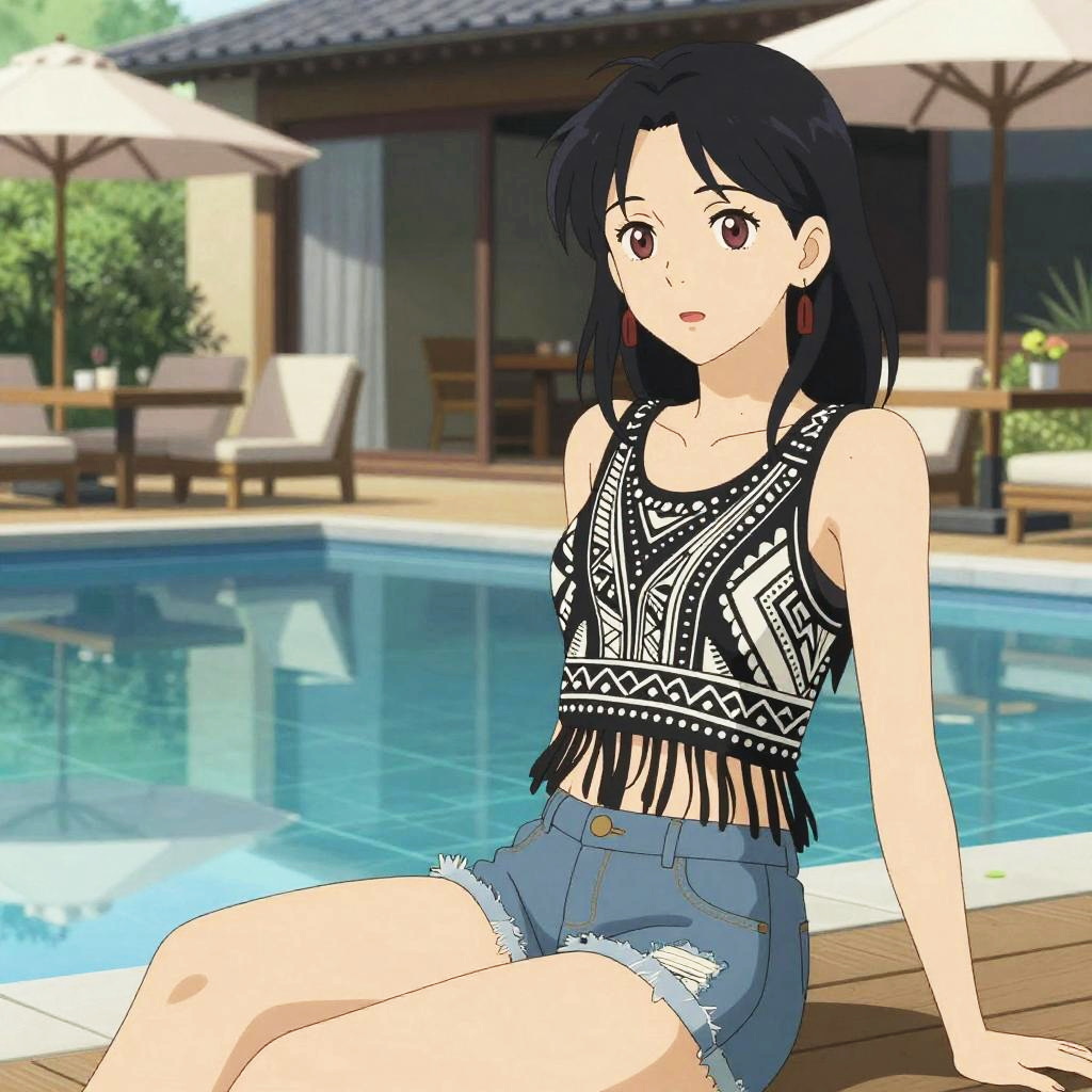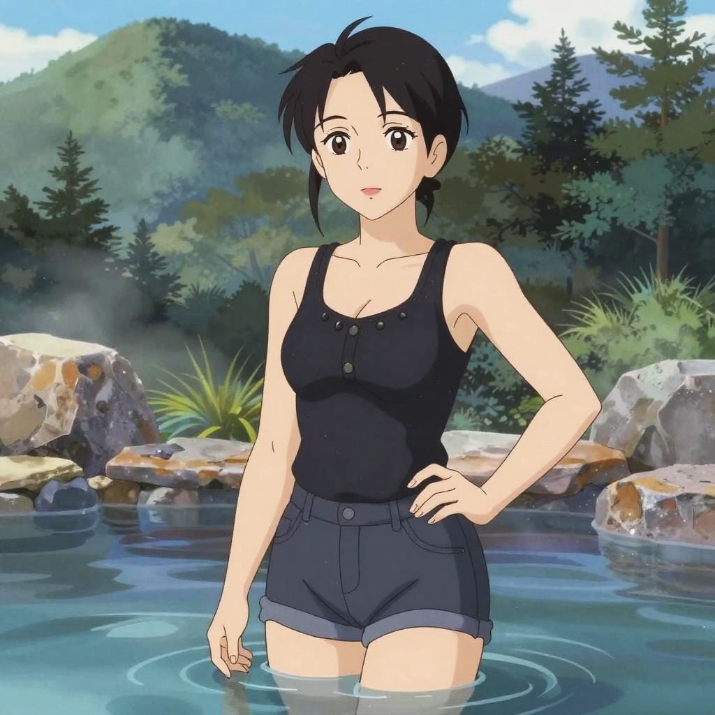 A woman in a casual chic black tank top with decorative buttons and fitted dark grey denim shorts, hand resting on hip, enjoying a hot spring in the Japanese mountains, in the style of Kyoto Animation. Sexy. Pretty face and beutiful eyes