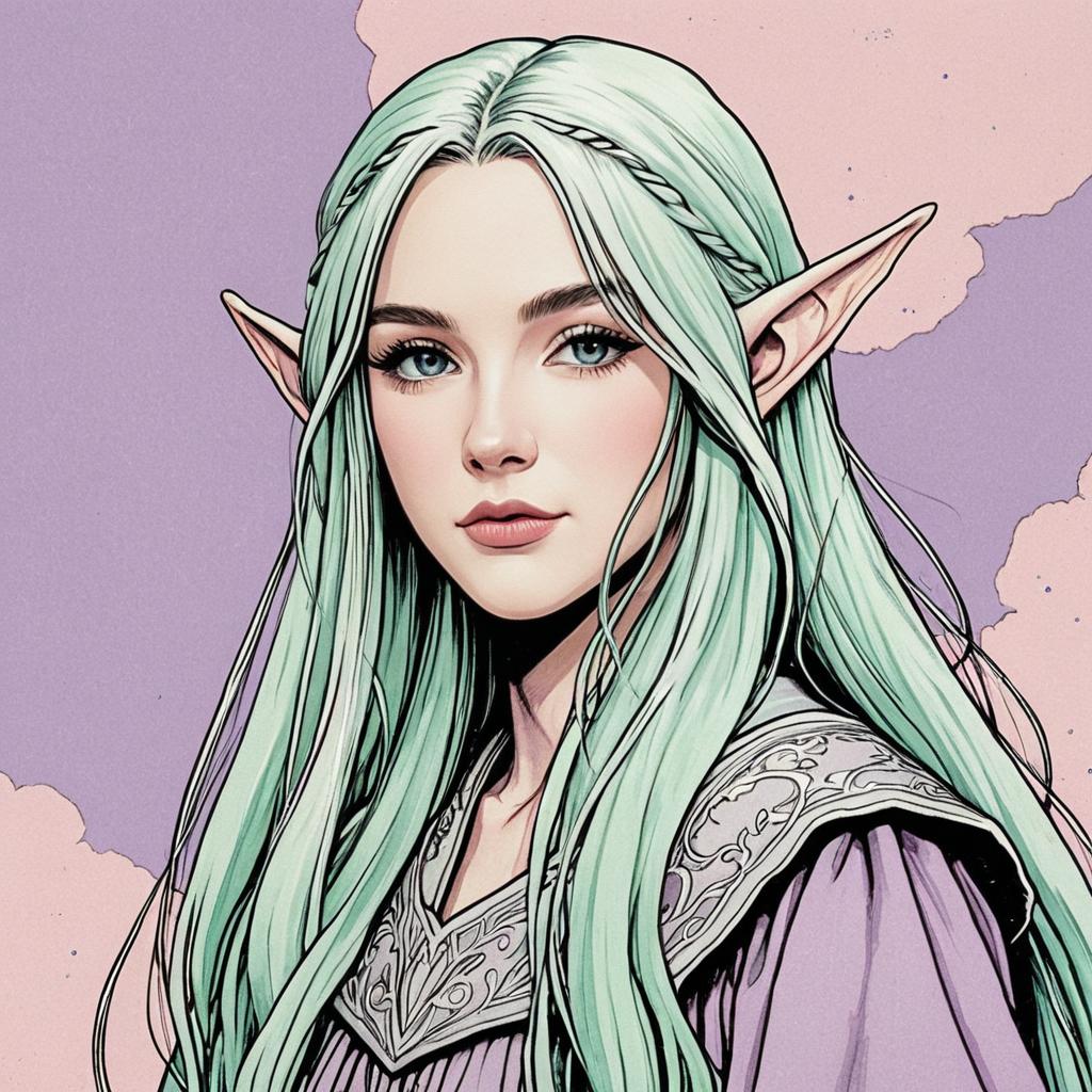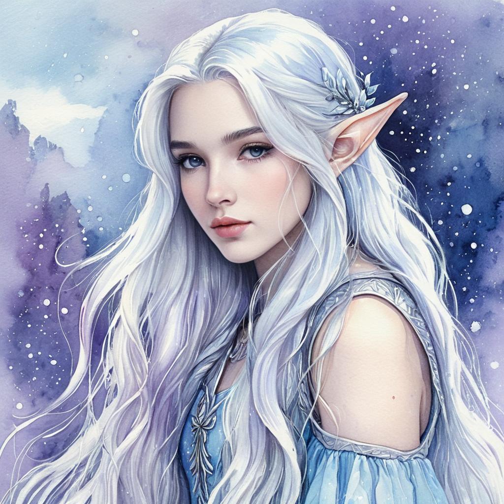 Illustration of an ethereal elf with long shimmering platinum hair, drawn with delicate watercolor strokes. The color palette includes icy blues, pale silvers, and soft lilac accents, set against an 80s-inspired background, showcasing a whimsical aesthetic with wondrous, evocative atmosphere, perfect for art print lovers.