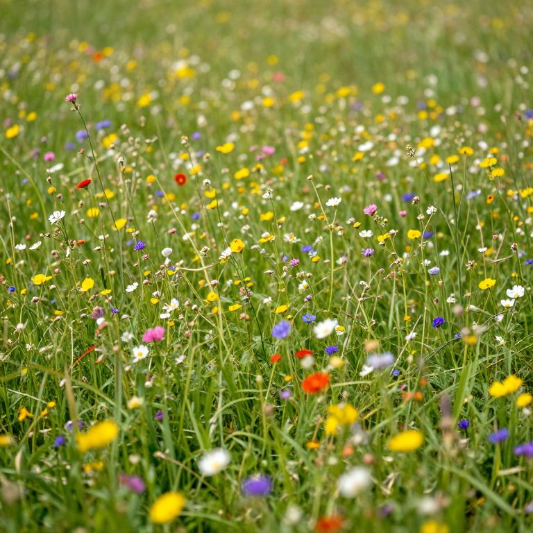 Photograph of a vibrant meadow filled with a colorful array of wildflowers. The foreground is dominated by tall, green grass interspersed with small, delicate blooms in yellow, white, red, blue, and purple. The flowers are scattered randomly, creating a natural, whimsical pattern. The background fades into a soft blur, emphasizing the lush, green field. The sunlight highlights the bright colors, making the meadow appear lively and fresh. The image captures the essence of a spring or summer day in a natural, outdoor setting.