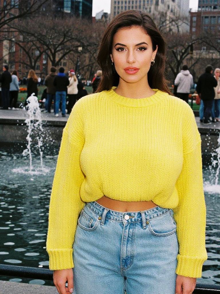 A woman in vibrant yellow oversized sweater and light-wash mom jeans stands by a bustling city park waterfall, showcasing a lithographic film style. Sexy. Pretty face and beаutiful eyes. Big breasts