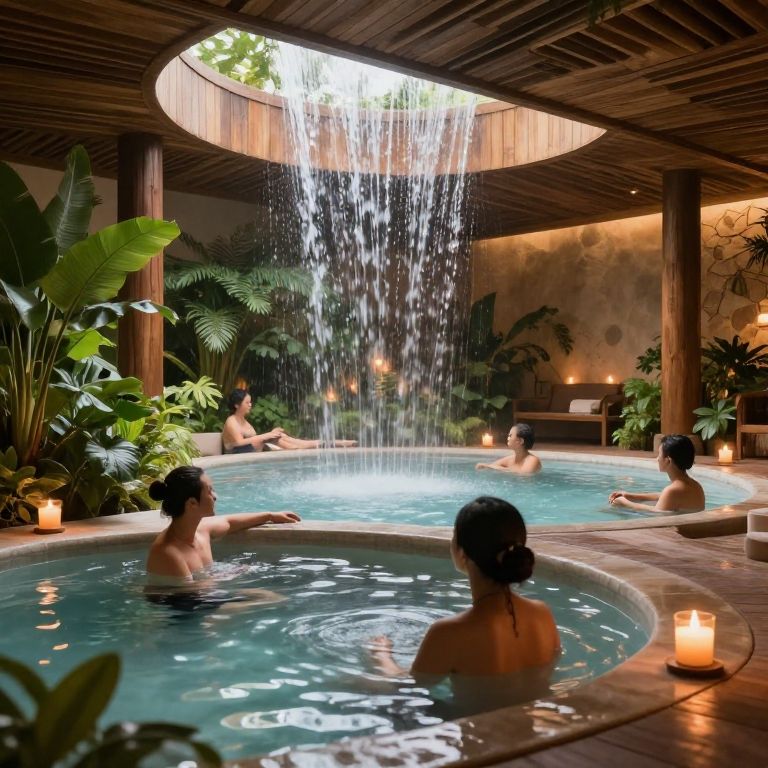 Wellnessbad interior with soothing natural light, cascading waterfalls, and warm wooden accents, serene atmosphere with people relaxing in hot pools surrounded by lush greenery and aromatic candles, ultra-realistic spa setting