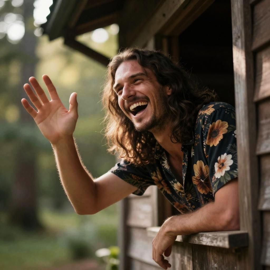 Photograph of a man with long brown hair, wearing a dark floral shirt, leaning out of a wooden structure, laughing with an open mouth and raised hand. Sunlight filters through trees in the background.