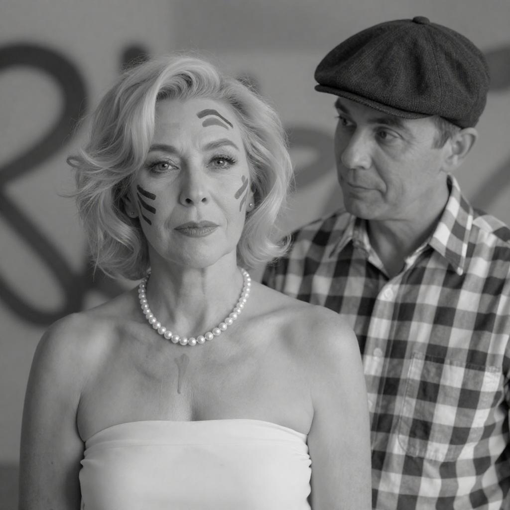 Black-and-white photograph of an older woman and man. The woman, with short, wavy blonde hair, wears a strapless white top and a pearl necklace. She has bold, black face paint stripes under her eyes. The man, with a cap and checkered shirt, stands behind her, looking to her left. The background features blurred graffiti. The woman's expression is calm, while the man's is slightly curious. The image has a vintage, candid feel.