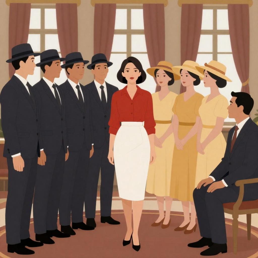 Colorful illustration of a royal ball with 22 people. Central figure is a woman in a white gown with a crown. Men in black suits and women in long dresses with shawls. Staircase on the right, red wall painting on the left. Green curtain in the background. People have formal, elegant appearances. Facial expressions are neutral.