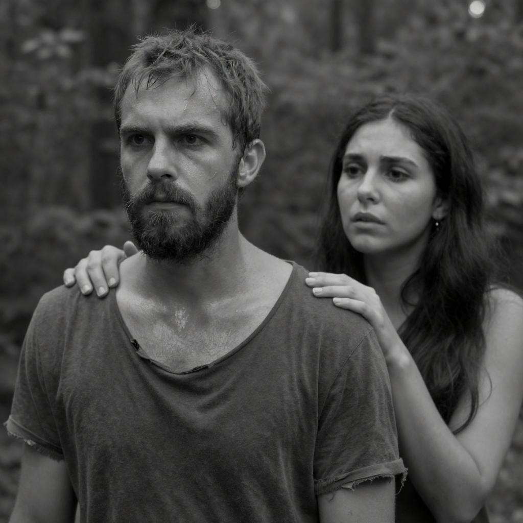 Black-and-white photograph. Three men. Left man with beard, short hair, loose shirt, intense expression. Middle man, short dark hair, serious expression, carrying another man. Right man, dark hair, hunched over, being carried, distressed expression. Wooden structure background.