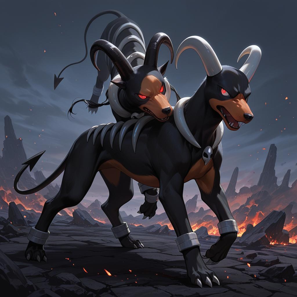Houndoom, pokemon, no humans, horns, red eyes, black hair, pokemon (creature), claws, by artist modare, dark_illustrious