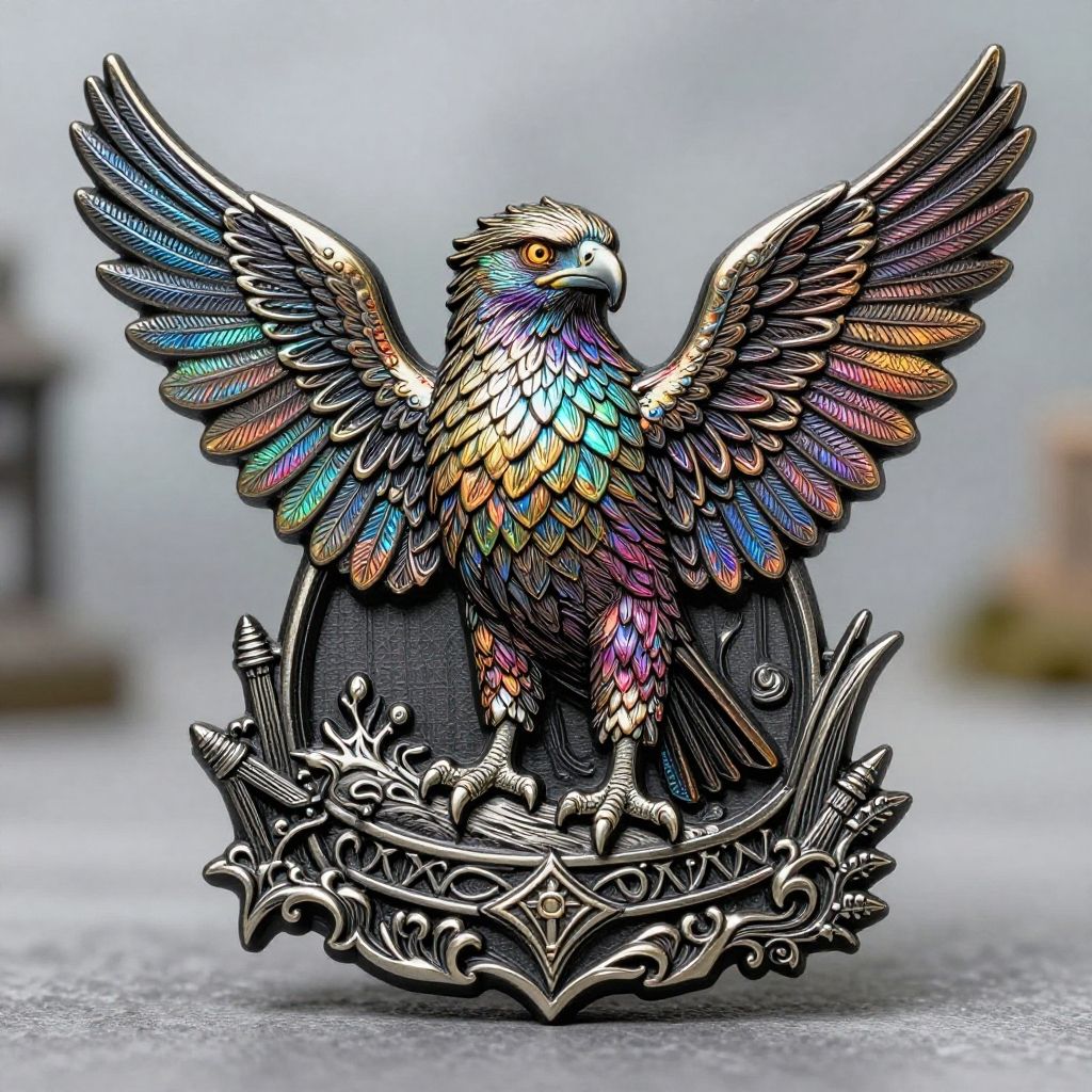 Colorful, detailed, metallic eagle with rainbow feathers, standing on an ornate, silver shield, set against a blurred, gray background. Digital artwork