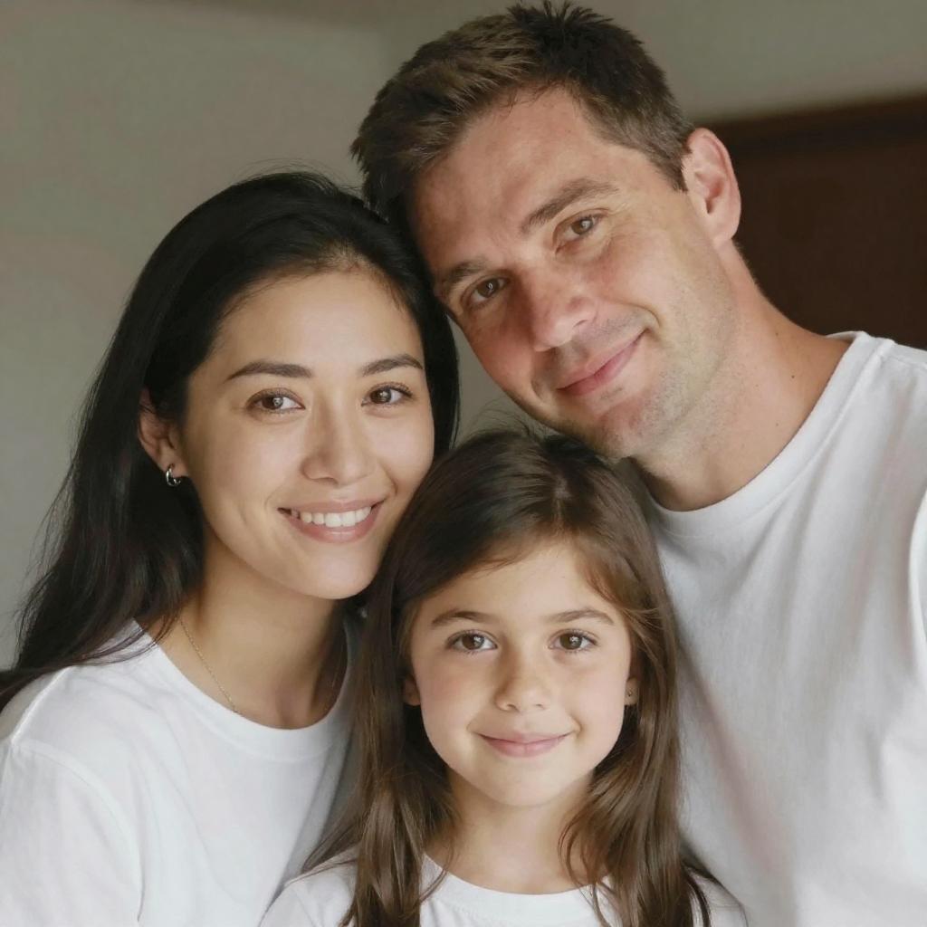 Photograph of a close-knit family portrait with soft, even lighting. The image is taken at a slight upward angle, capturing a man with short brown hair, a woman with black hair, and a young girl with brown hair. They're all wearing white shirts, and the man is slightly leaning over the woman and girl, who are nestled closely. The background is dark and blurred, keeping the focus on the family. The depth of field is shallow, emphasizing their faces.