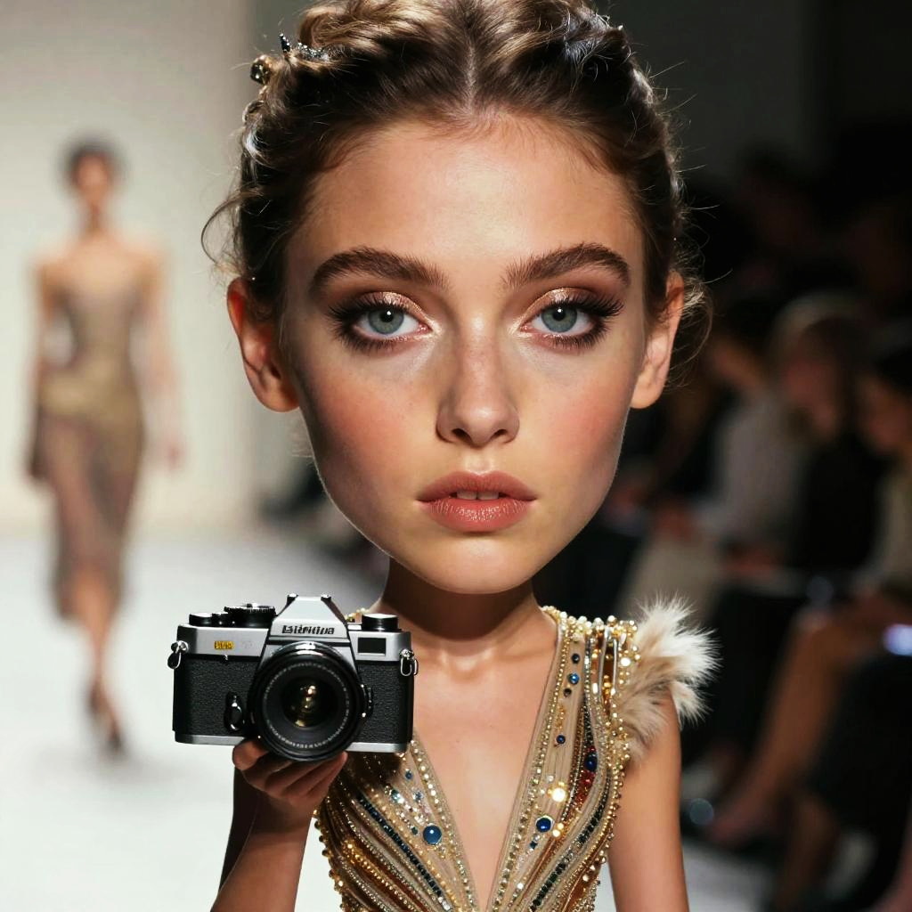 Photorealistic digital artwork of a woman's face with dark sunglasses, slicked-back brown hair, and black stockings, standing on tiptoe against