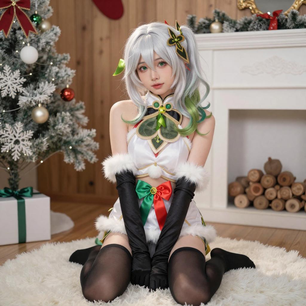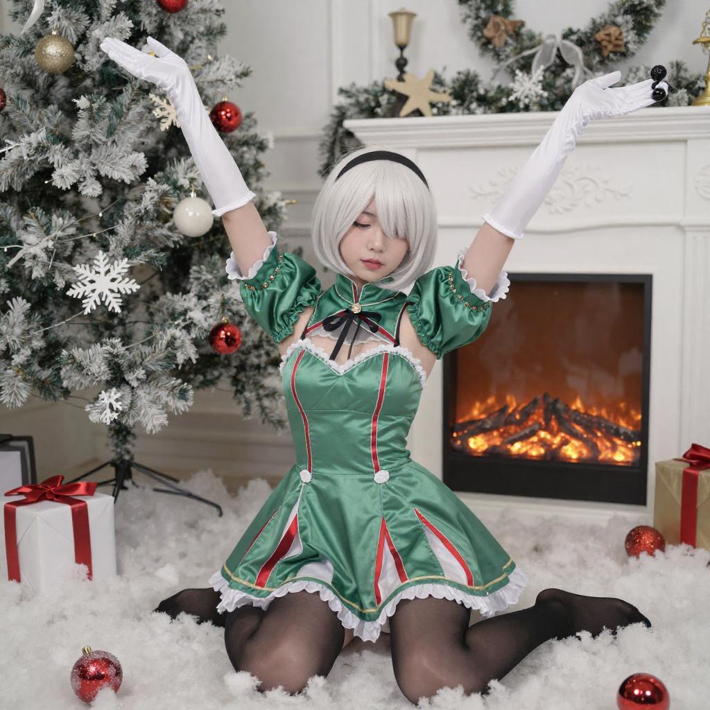 Photograph of a woman with short white hair, green and red scarf, white fur trim, black stockings, and black gloves, sitting on a white shag rug in front of a wooden wall. She holds a gold gift bag, with a decorated Christmas tree and fireplace adorned with red and white ornaments in the background.