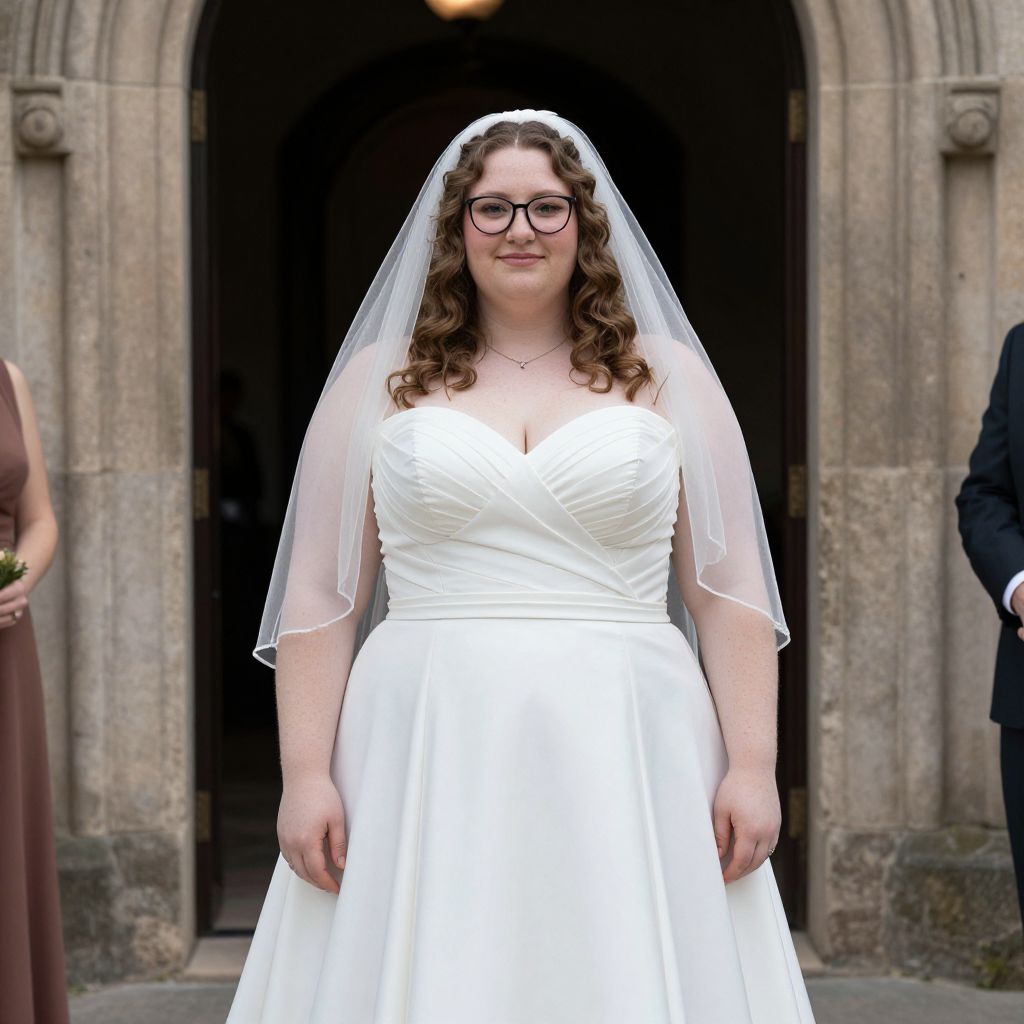 Photograph of a plus-size woman with curly brown hair and glasses, wearing a white, strapless wedding gown with a sweetheart neckline and a long veil. She stands in front of an arched stone doorway, with two partially visible people on either side. Her gown is fitted at the top, emphasizing her large breasts, and flows out at the bottom. She smiles softly at the camera.
