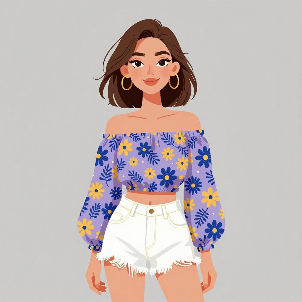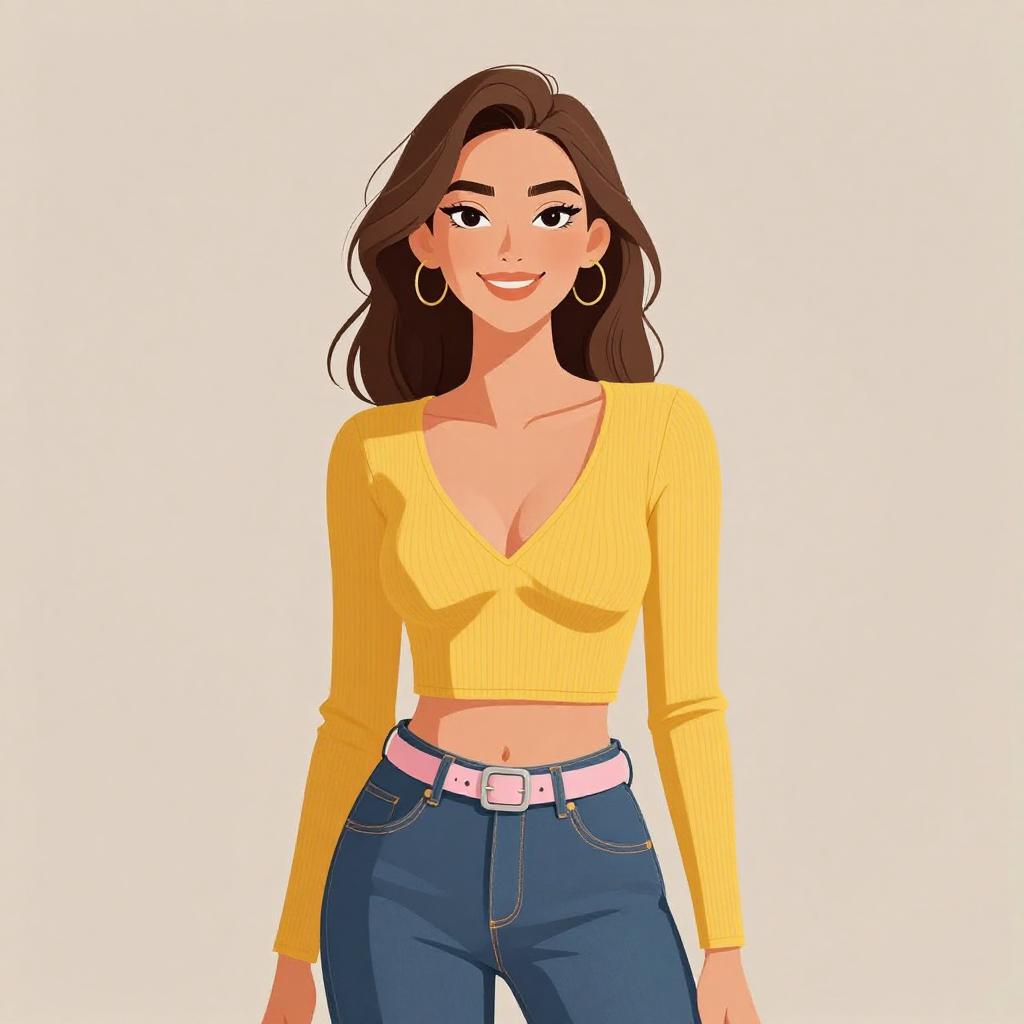 Woman with pretty face and pretty hair. smiling Woman, casual chic, mustard yellow crop top with polka dot texture, deep V-neckline, front knot detail, long balloon sleeves with fitted cuffs, high-waisted light blue denim jeans with mild distressing, gold hoop earrings, white background. --sref 1467